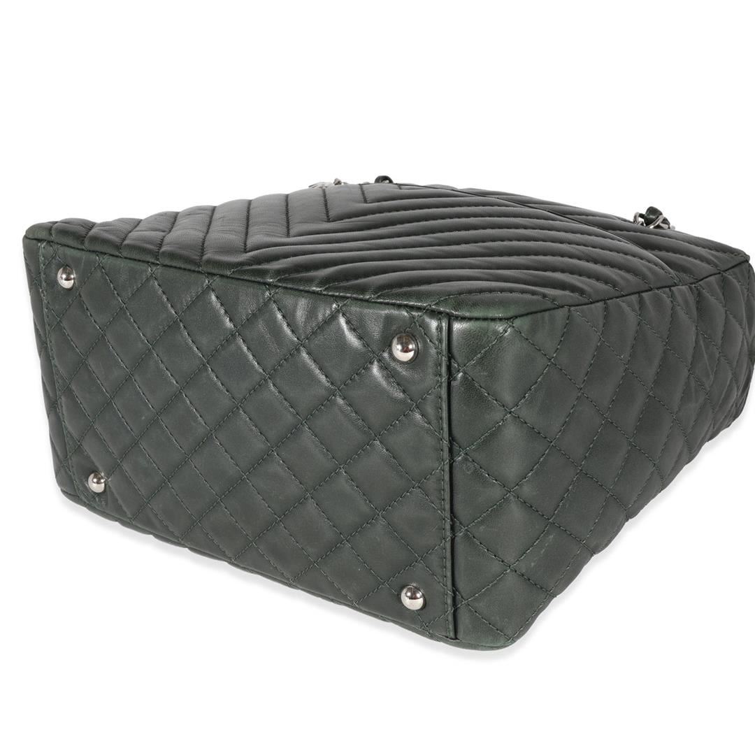 One Chanel Surpique Tote. Item is sold AS-IS. All available information is listed in the description and shown in the photo. Chanel Olive Green Chevron Quilted Surpique Tote. Features silver hardware, green leather strap, green canvas interior, and a zipper closure.