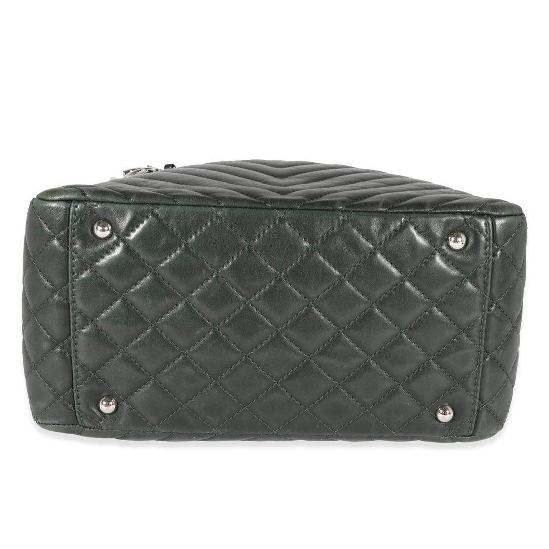 One Chanel Surpique Tote. Item is sold AS-IS. All available information is listed in the description and shown in the photo. Chanel Olive Green Chevron Quilted Surpique Tote. Features silver hardware, green leather strap, green canvas interior, and a zipper closure.