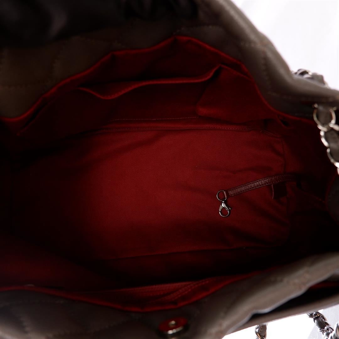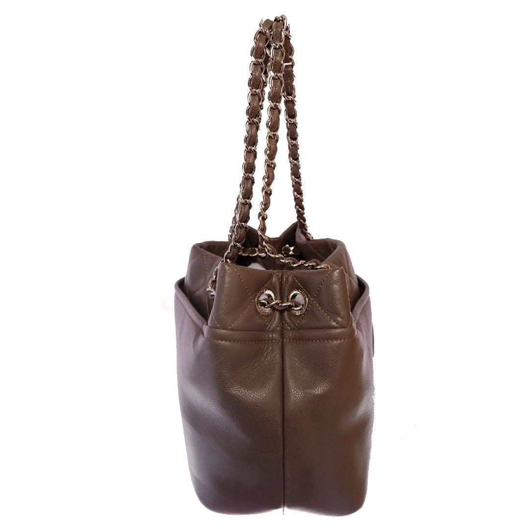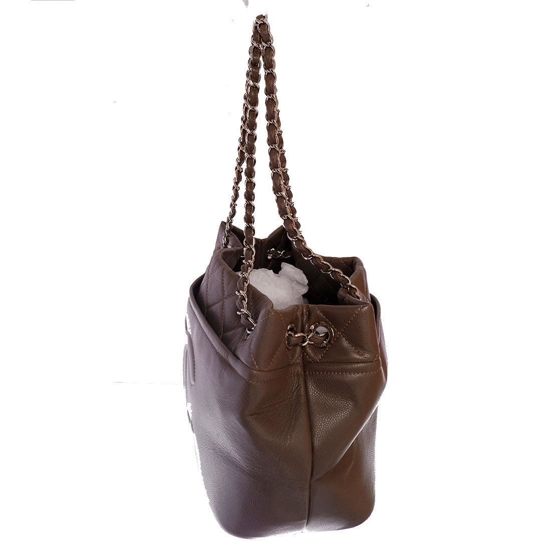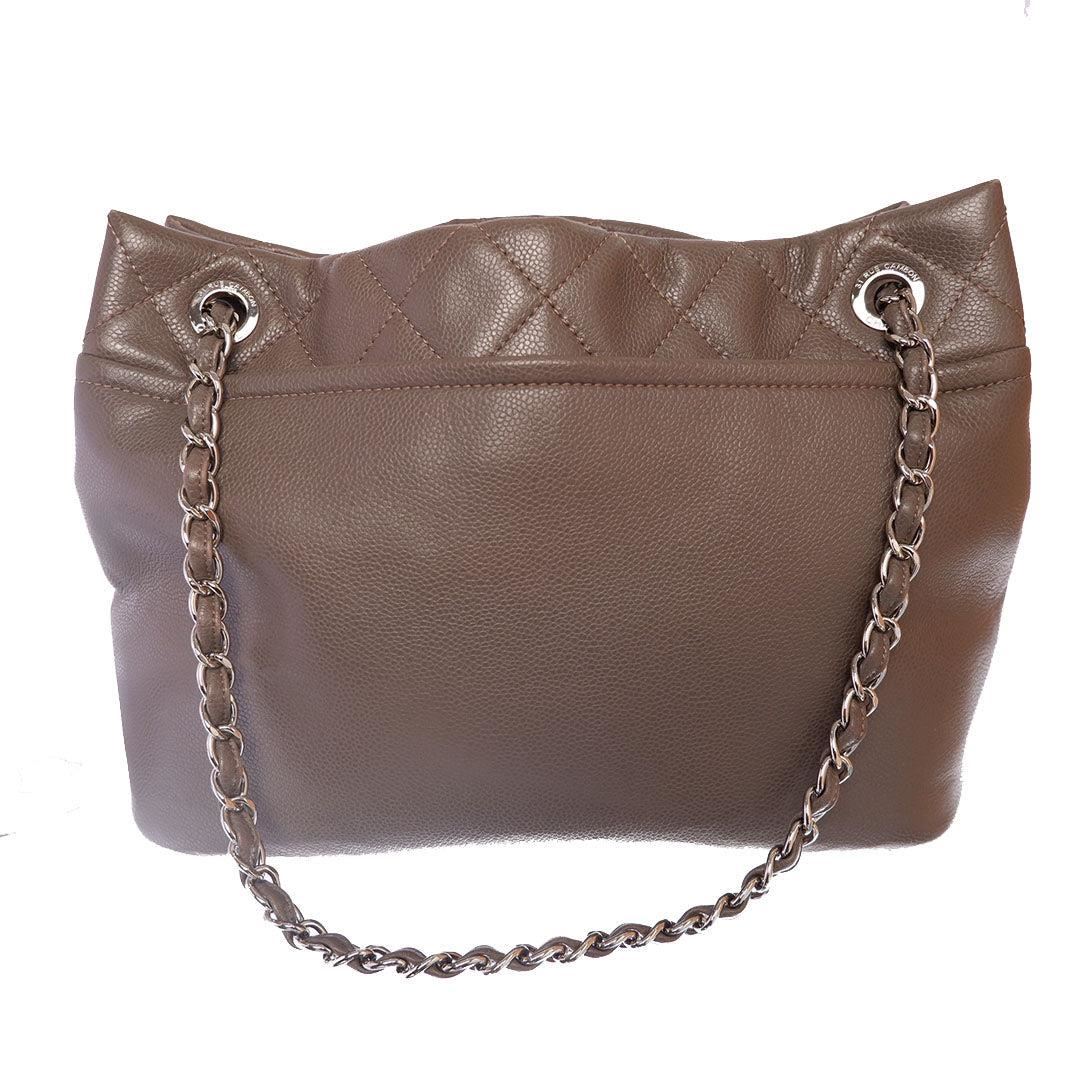 One Chanel Taupe Caviar Leather Timeless CC Soft Shopping Tote Bag. Item is sold AS-IS. Please check photos and descriptions for all available details. Taupe soft Caviar leather Chanel Timeless CC Soft Shopping tote bag silver-tone hardware, a bold interlocking CC logo stitched on the front exterior body, dual woven chain-link and leather shoulder straps, diamond-quilt accent at top of the bag and red canvas-lined interior with two exterior pockets inside. Height: 10" Length: 12" Width: 5.5" Strap Drop: 12"