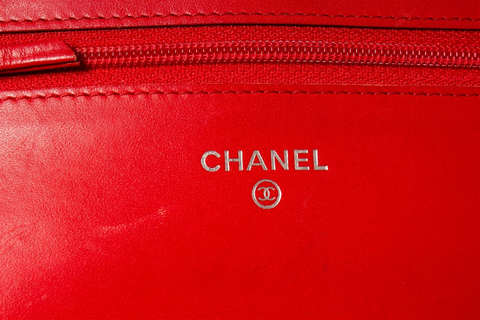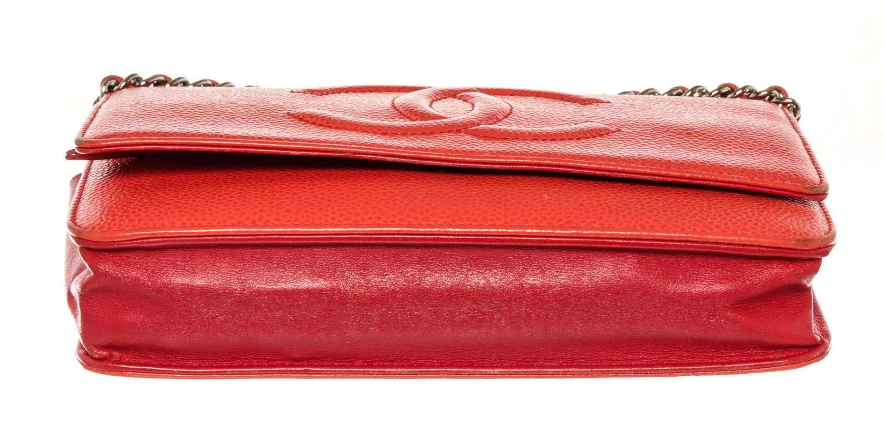 One Chanel Timeless CC WOC. Item is sold AS-IS. All available information is listed in the description and shown in the photo. Chanel Timeless CC WOC. Features a textured caviar pink leather with an embossed Chanel CC logo on the front. The bag features a leather threaded silver chain and a crossover flap. The interior is made up of pink leather and brown fabric, with card slots, patch pockets, and a zipper compartment.