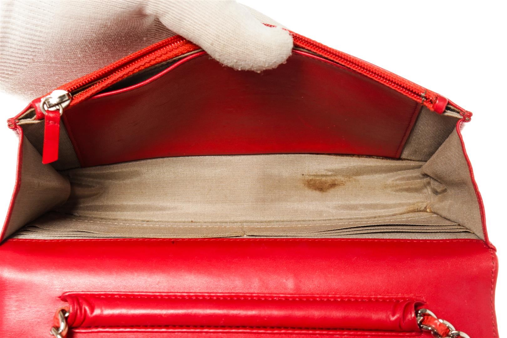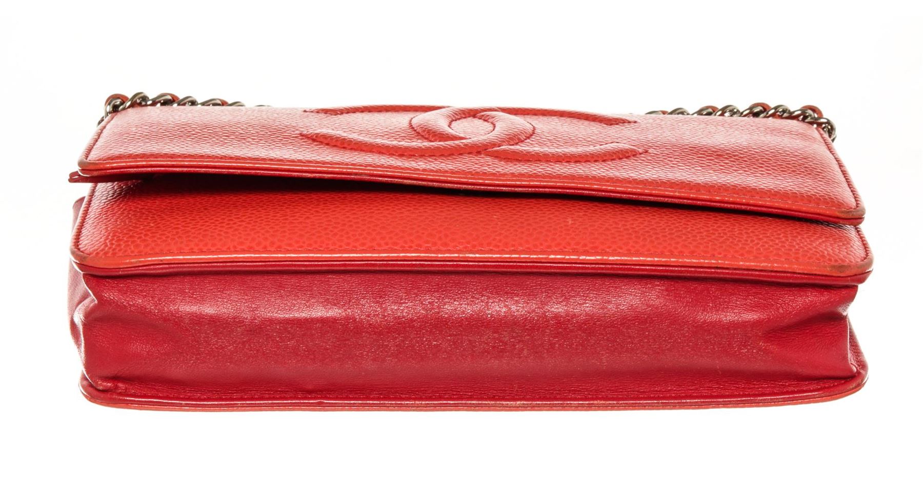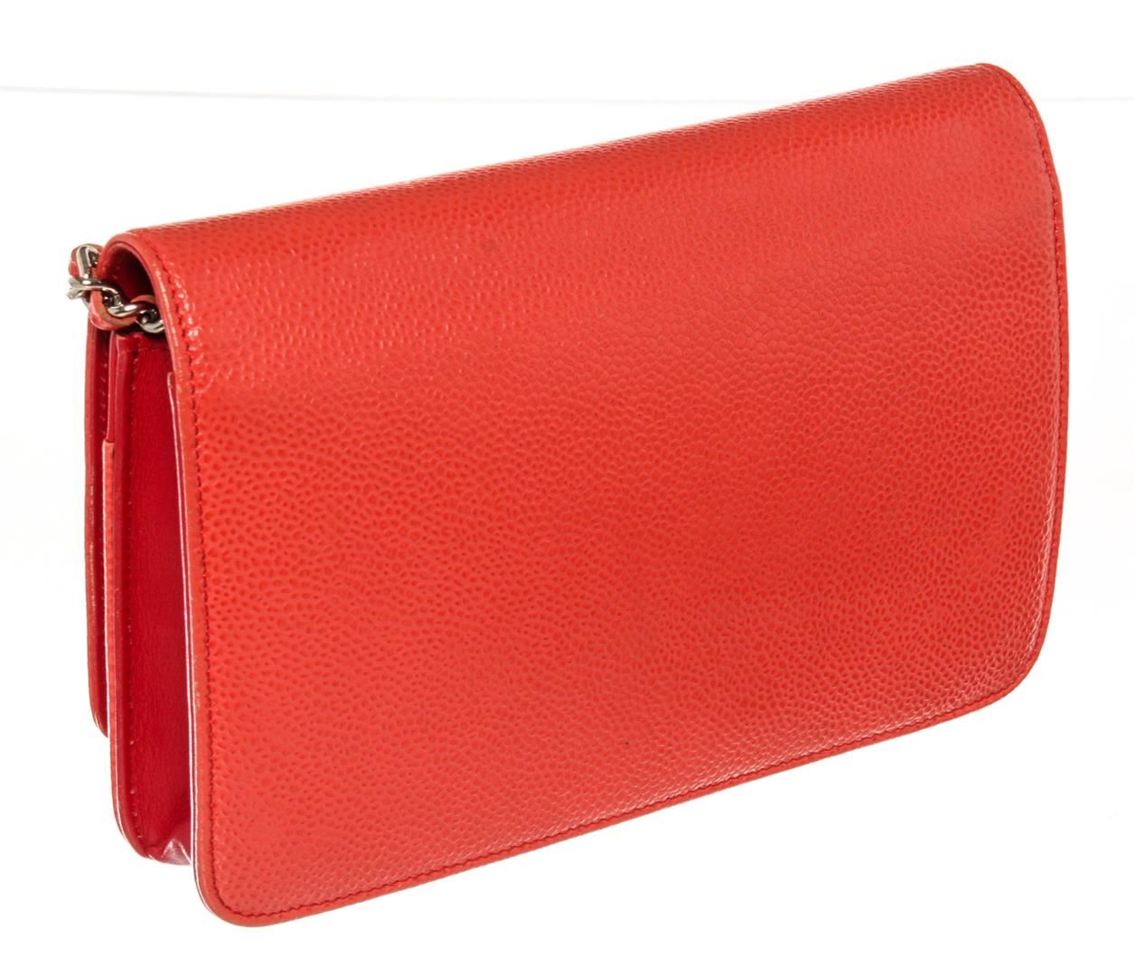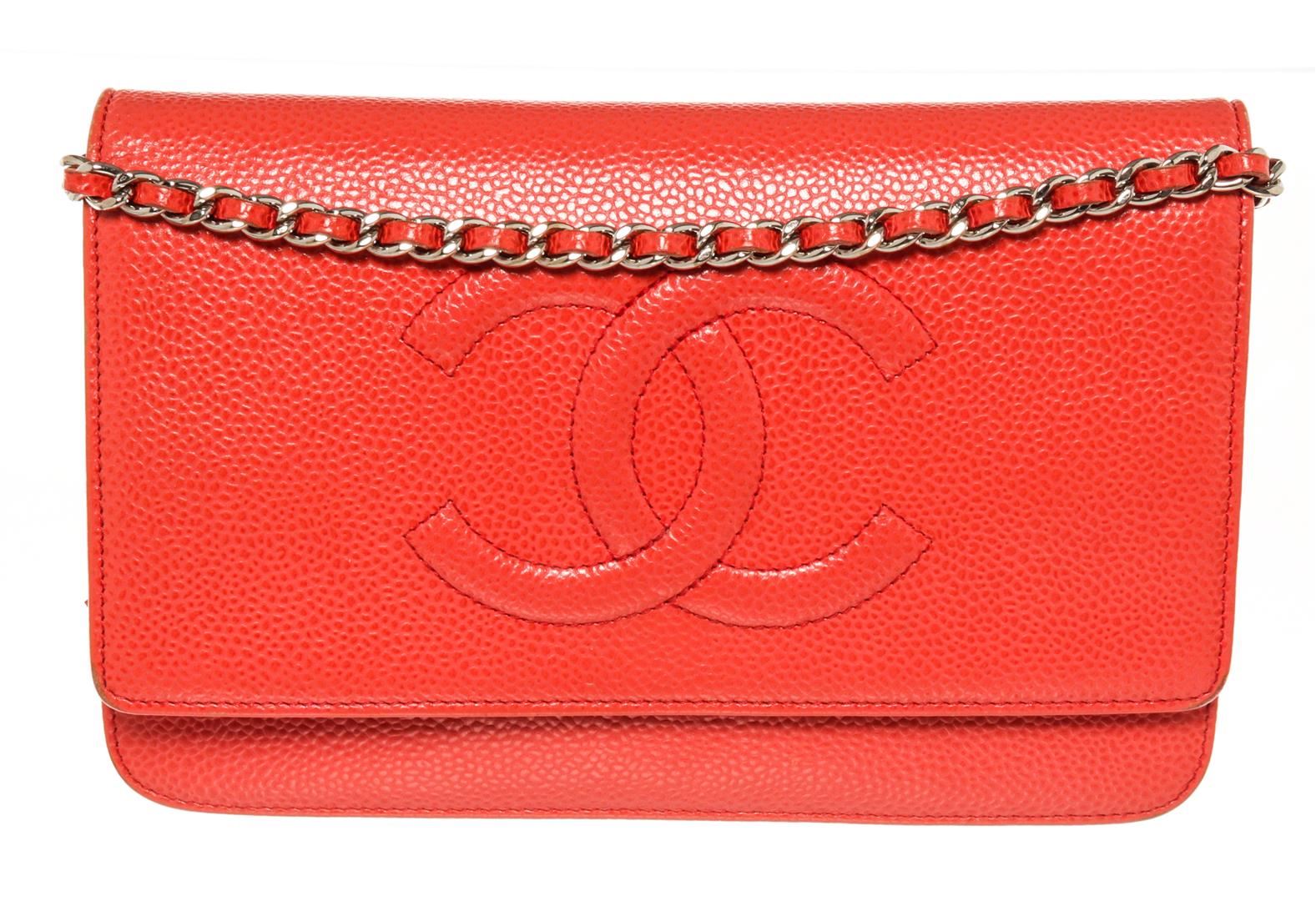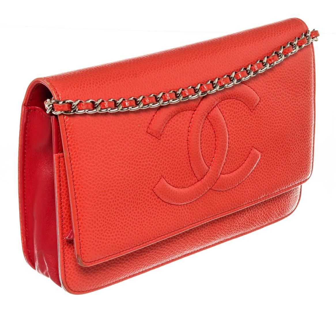 One Chanel Timeless CC WOC. Item is sold AS-IS. All available information is listed in the description and shown in the photo. Chanel Timeless CC WOC. Features a textured caviar pink leather with an embossed Chanel CC logo on the front. The bag features a leather threaded silver chain and a crossover flap. The interior is made up of pink leather and brown fabric, with card slots, patch pockets, and a zipper compartment.