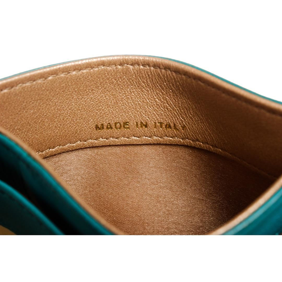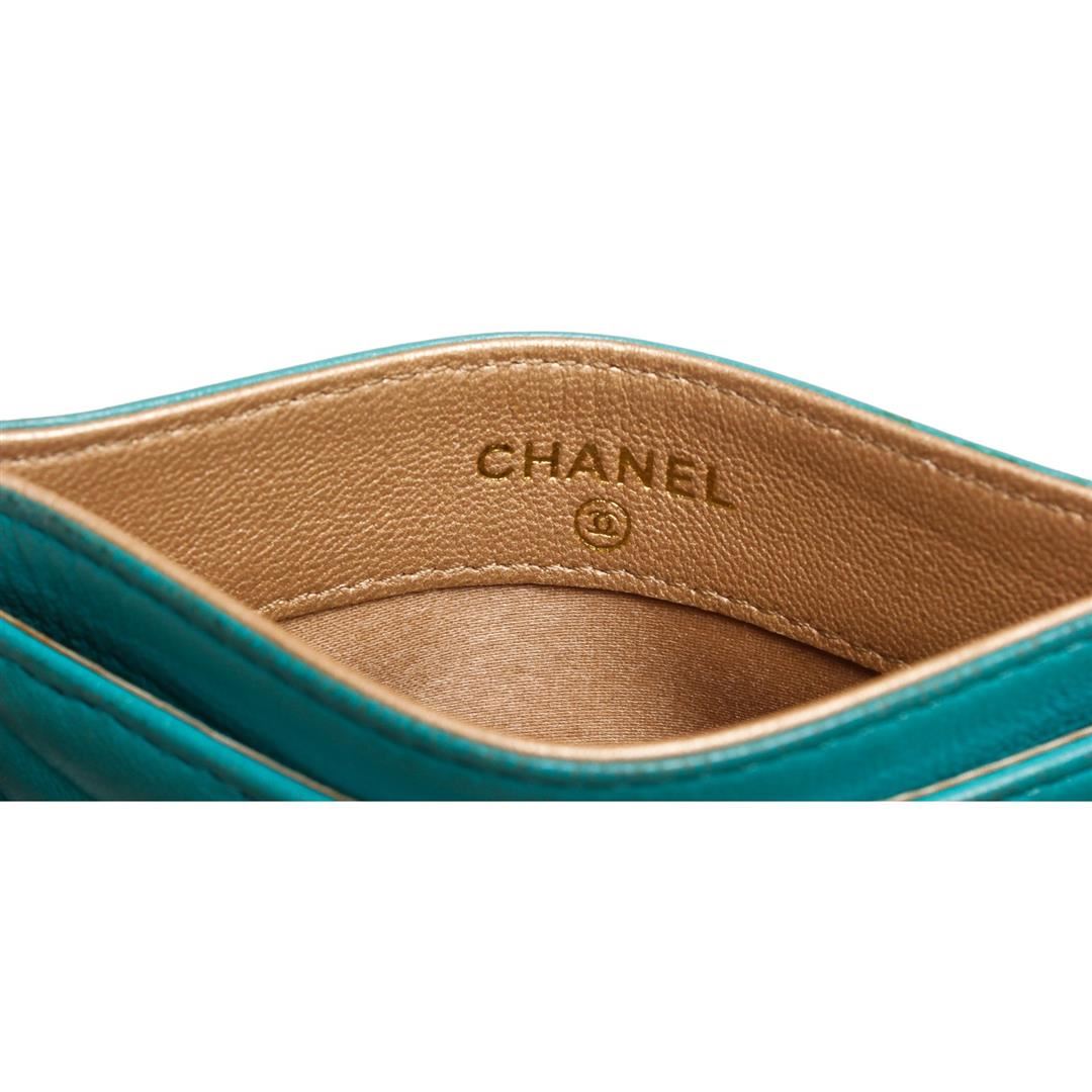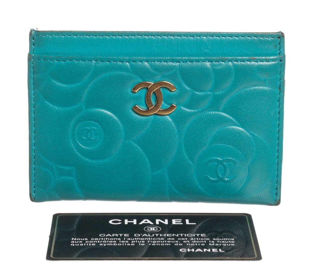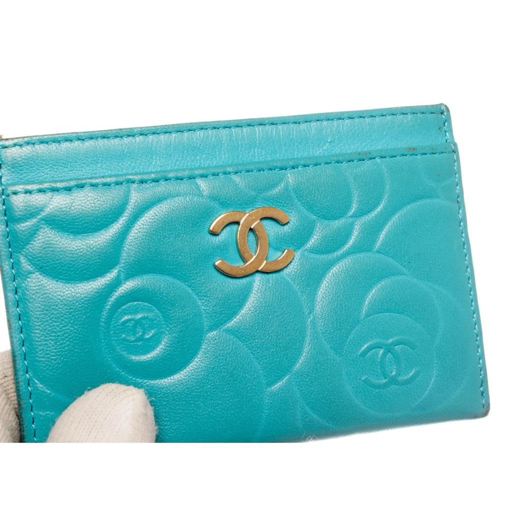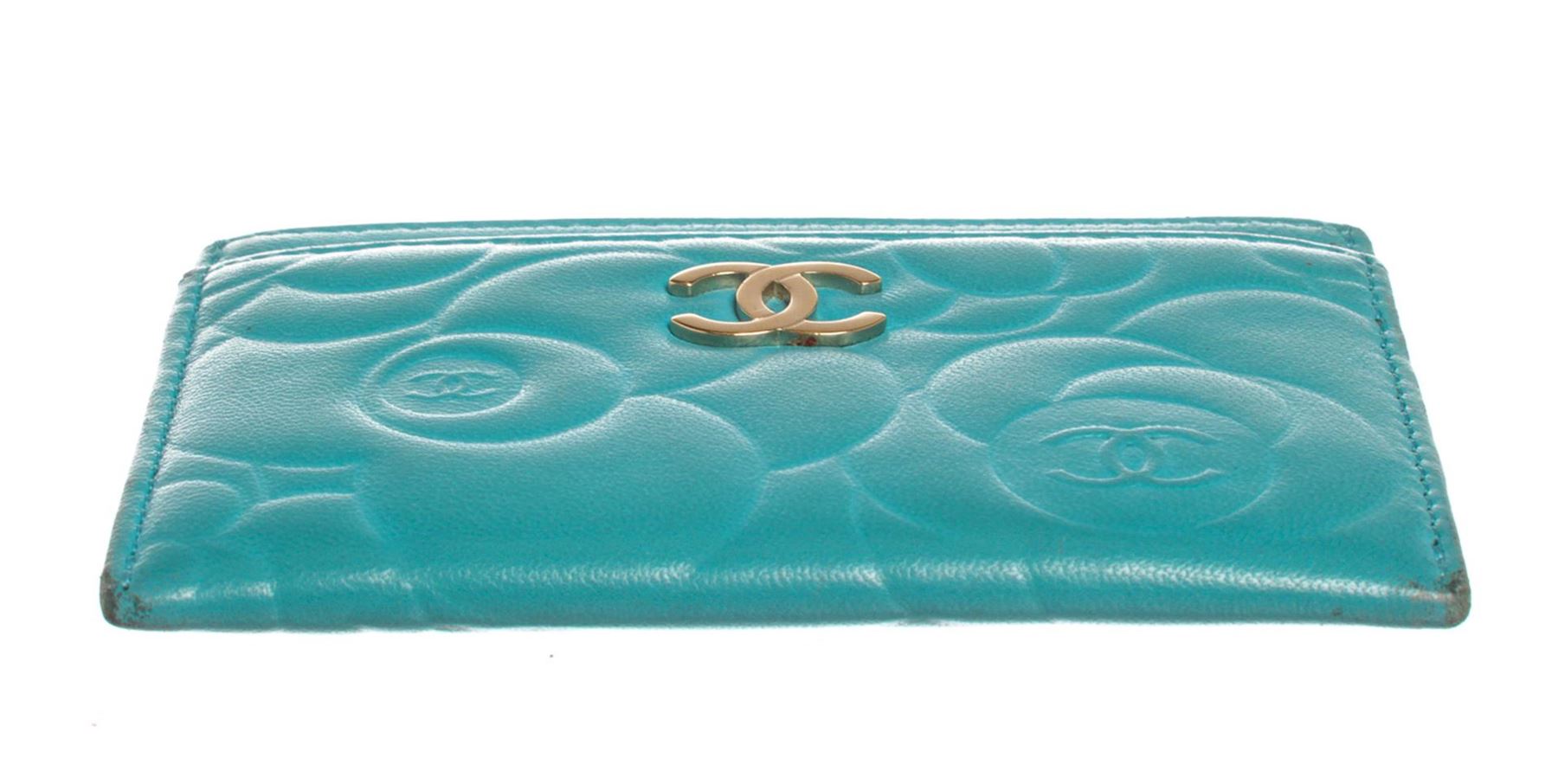Crafted out of turquoise blue camellia flower embossed lambskin leather, CC gold-tone logo, and tonal leather. Includes Authenticity Card.