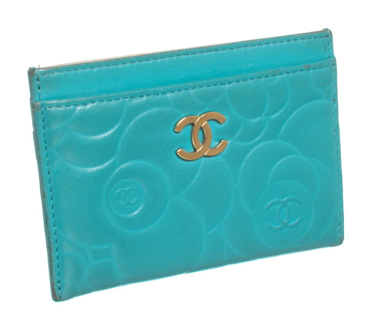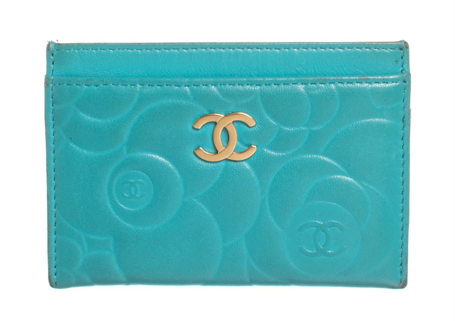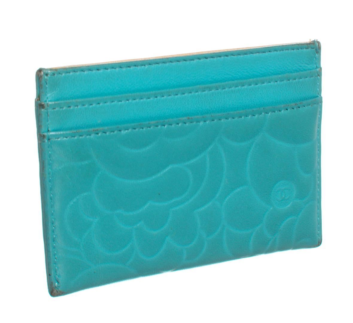 Crafted out of turquoise blue camellia flower embossed lambskin leather, CC gold-tone logo, and tonal leather. Includes Authenticity Card.