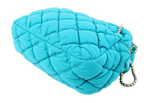 One Chanel Turquoise Blue Quilted Bubble Jersey Snake Effect Chain Shoulder Bag. Item is sold AS-IS. All available information is listed in the description and shown in the photo. Chanel Turquoise Quilted Bubble Jersey Snake Effect Chain shoulder bag is crafted in a quilted pattern, this bag features a fabric shoulder pad with snake-effect chain link straps in silver-tone hardware. The full zipper closure opens to a finely black textile-lined interior with one zip pocket and two slip pockets. Length 27 cm, Width 9 cm, Height 18 cm, Handle Drop 29 cm