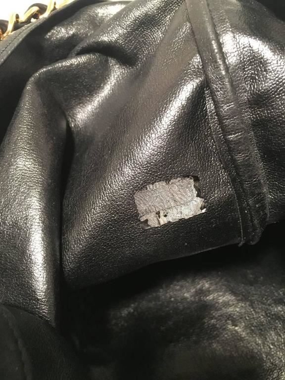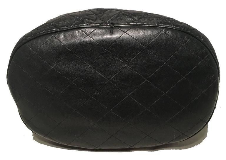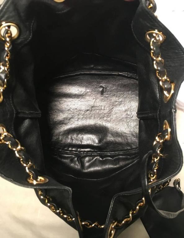 BEAUTIFUL Chanel black leather drawstring bucket bag in very good vintage condition. Black lambskin leather with quilted leather bottom trimmed with gold woven chain and leather double shoulder strap and drawstring style closure. Fully lined black leather interior with attached small black leather zippered pouch. Very good vintage condition. No stains or smells. A few delicate scuffs on interior consistent with age and use. Missing hologram but remnants still visible (see photos for details). Perfect for collectors and fashion lovers alike. A timeless piece from Chanel that comfortably carries all your essentials. Purchase includes a dust cover. Measurements: 10.5"x7"x10" 17" strap drop#Bags1262