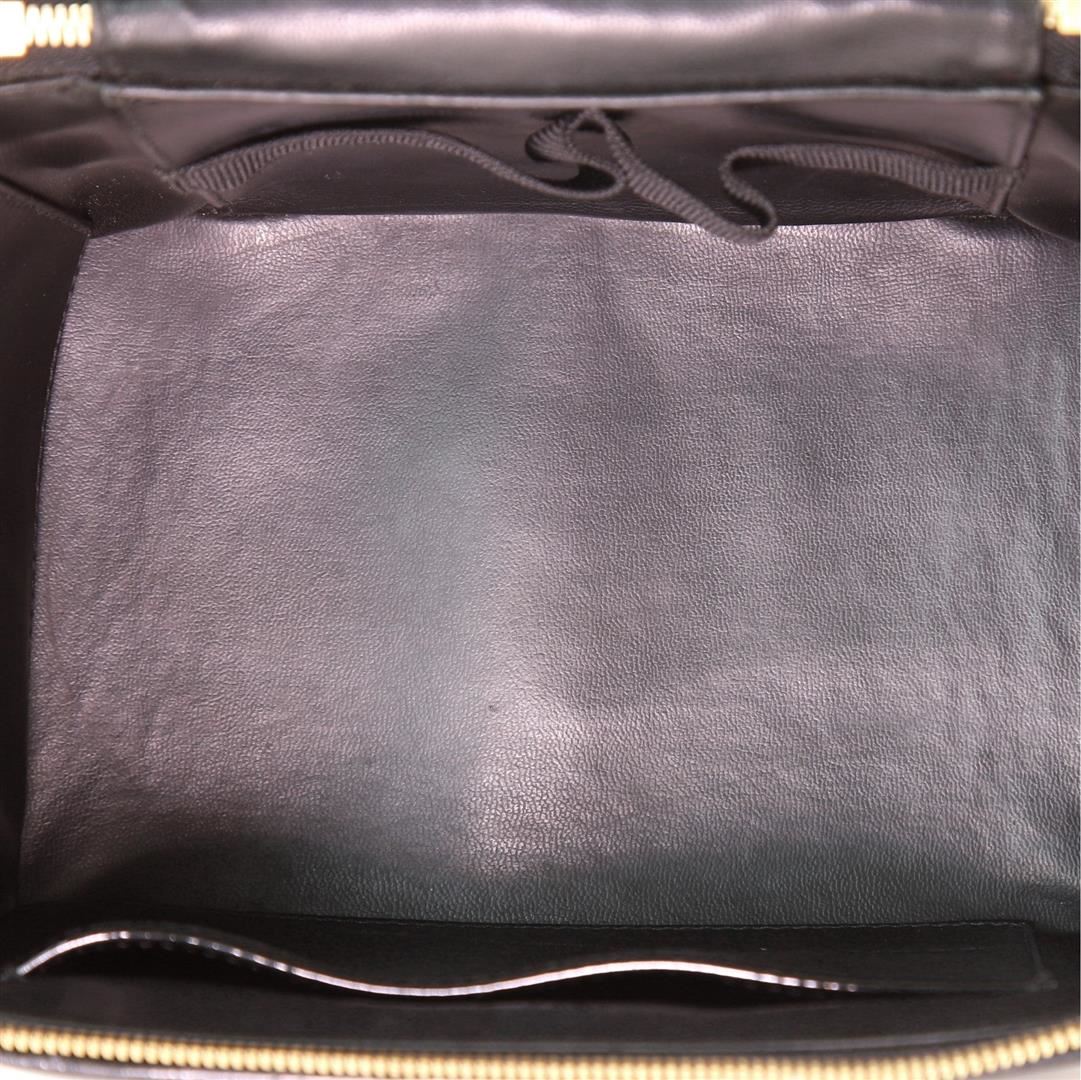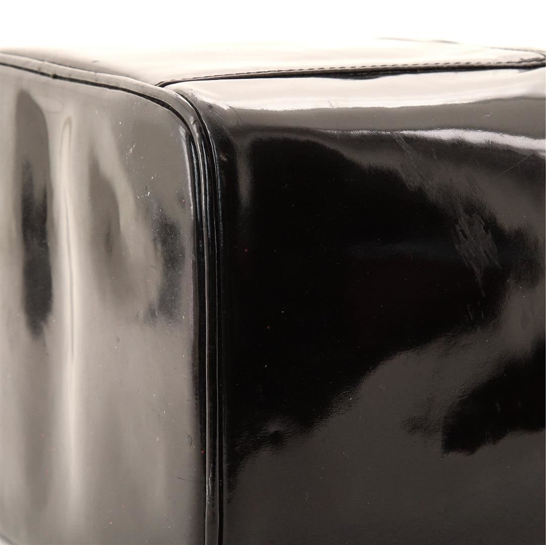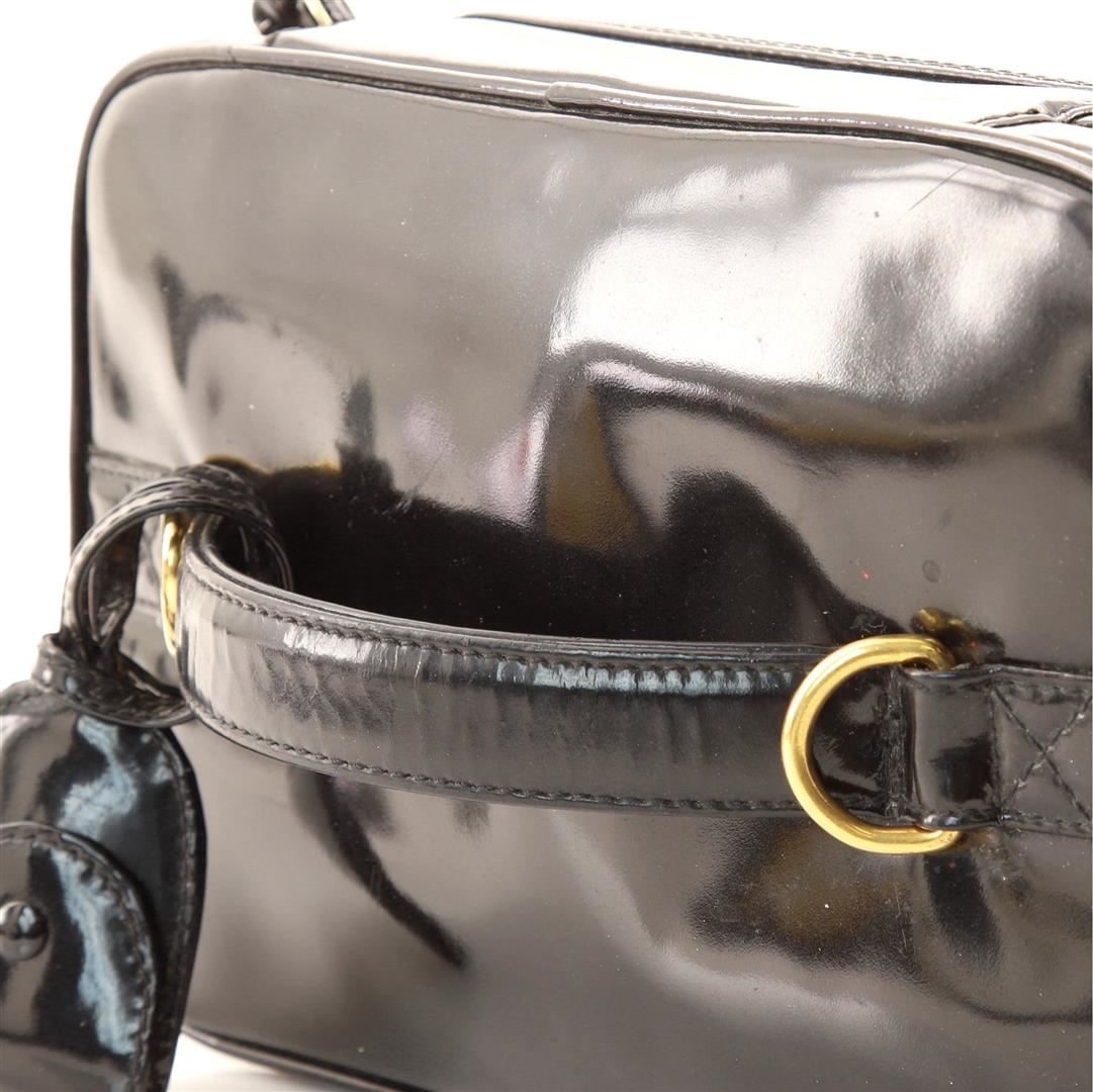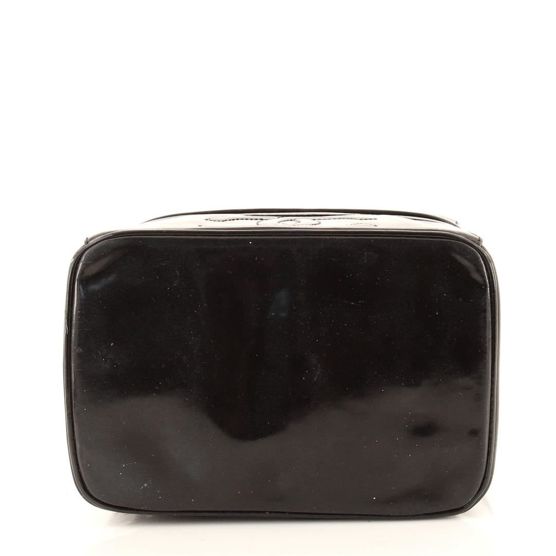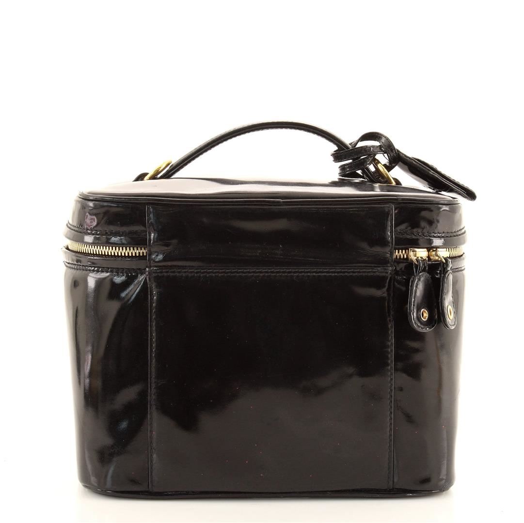 One Chanel Vintage Black Patent Leather Timeless Small Vanity Case. Item is sold AS-IS. All available information is listed in the description and shown in the photo. Black Vernis leather Chanel Timeless Vanity case with gold-tone hardware, single flat top handle, quilted panel at the base, tonal leather lining, single pocket at interior wall, and zip closure at top. Height 7", Width 9", Depth 5", Strap Drop 21"