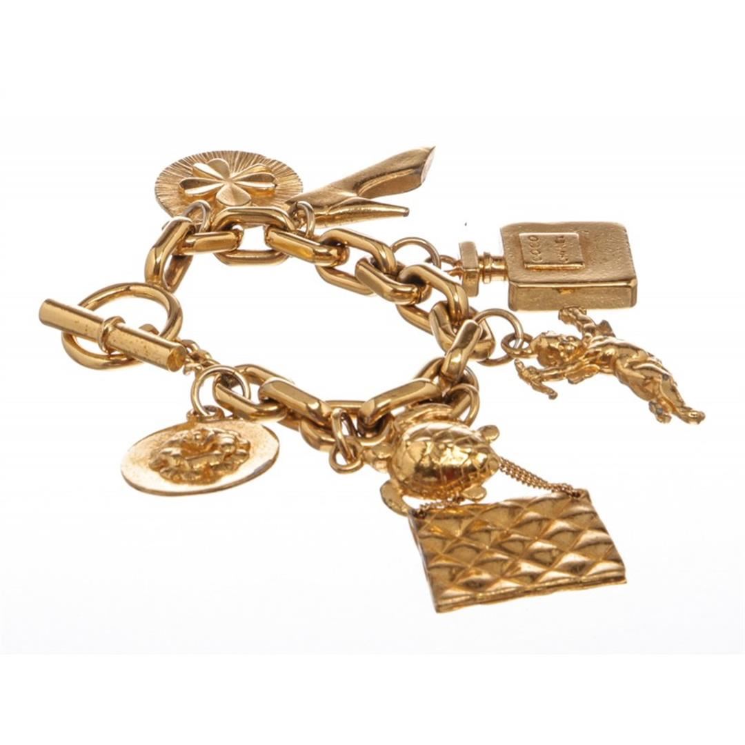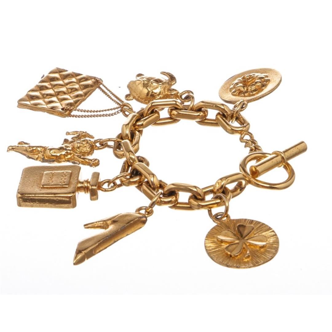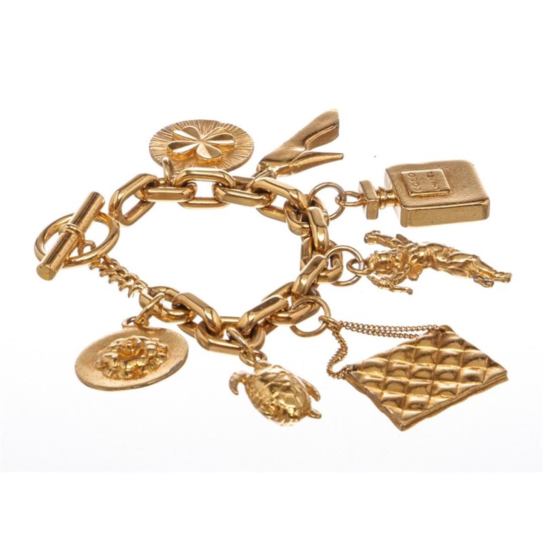 Chanel Vintage Gold 7-Icon Dangling Charm Bracelet with a four-leaf clover, high heel pump, Chanel No. 5 perfume bottle, angel, quilted "CC" classic handbag, turtle, and camellia and a toggle closure. Box included. Item is pre-owned.