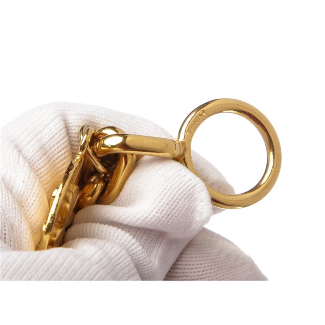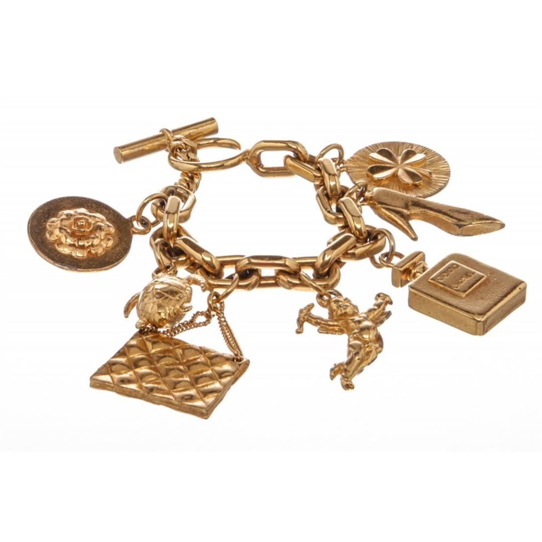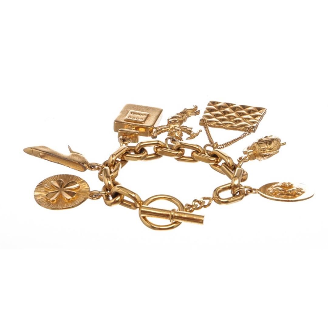 Chanel Vintage Gold 7-Icon Dangling Charm Bracelet with a four-leaf clover, high heel pump, Chanel No. 5 perfume bottle, angel, quilted "CC" classic handbag, turtle, and camellia and a toggle closure. Box included. Item is pre-owned.