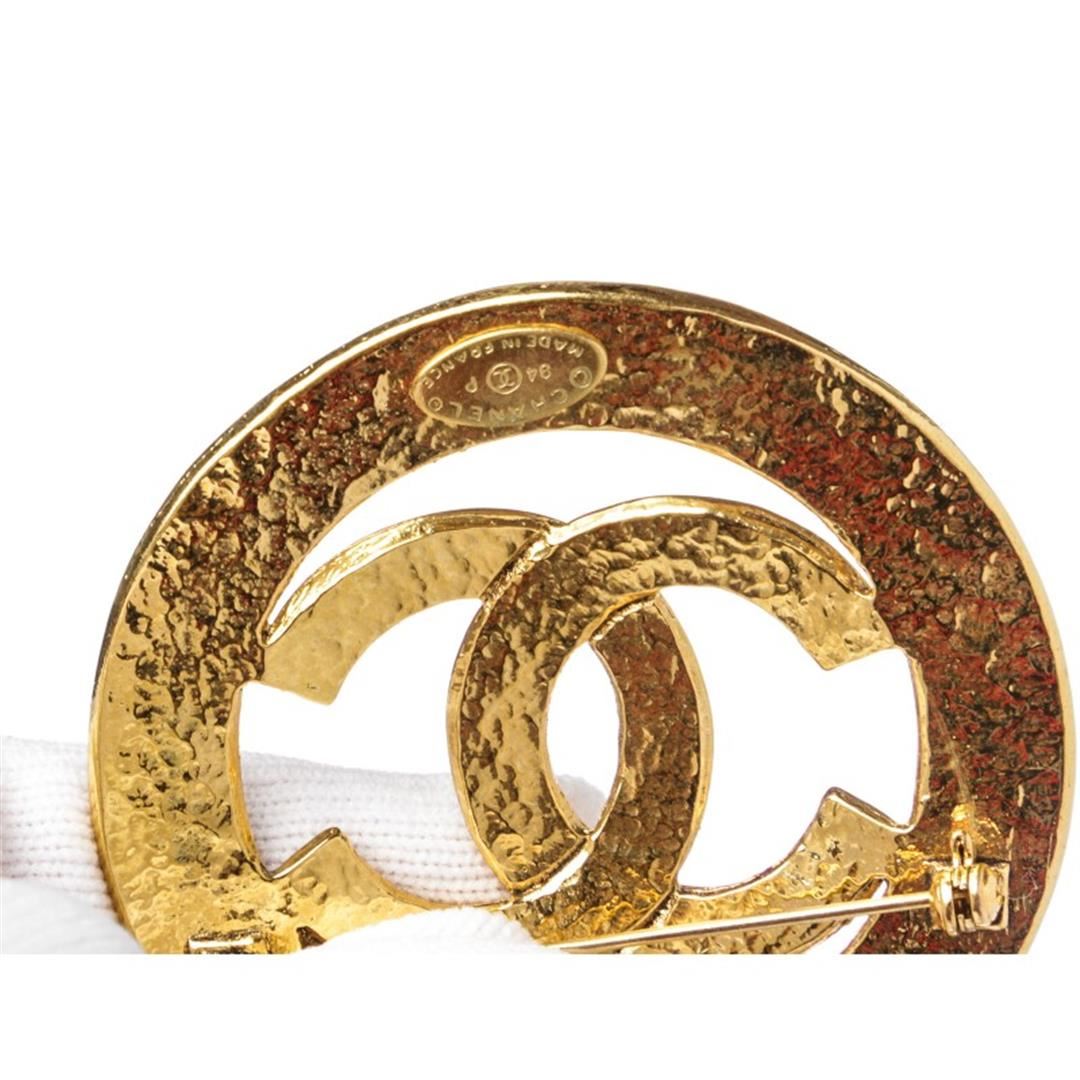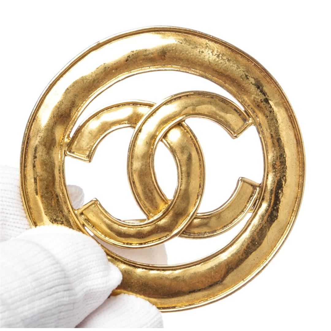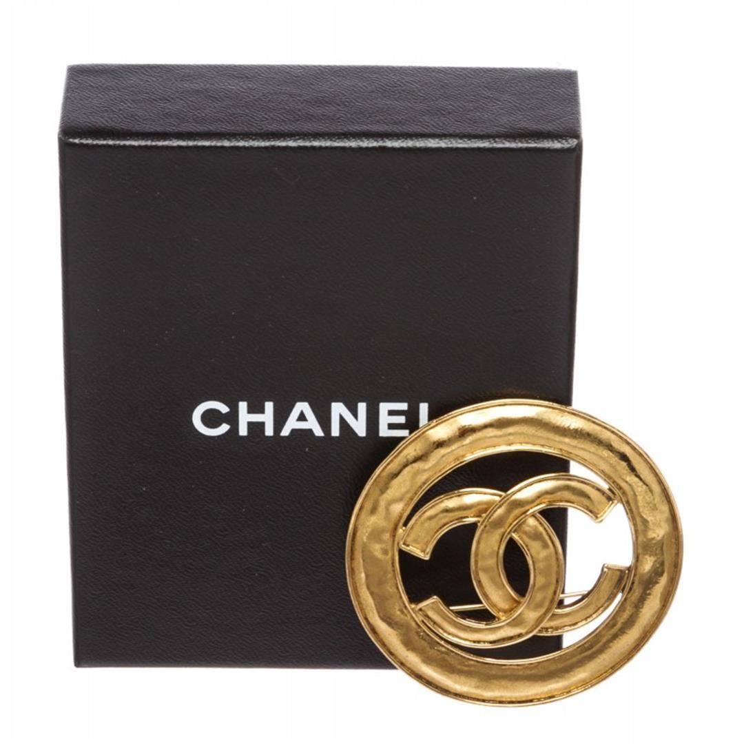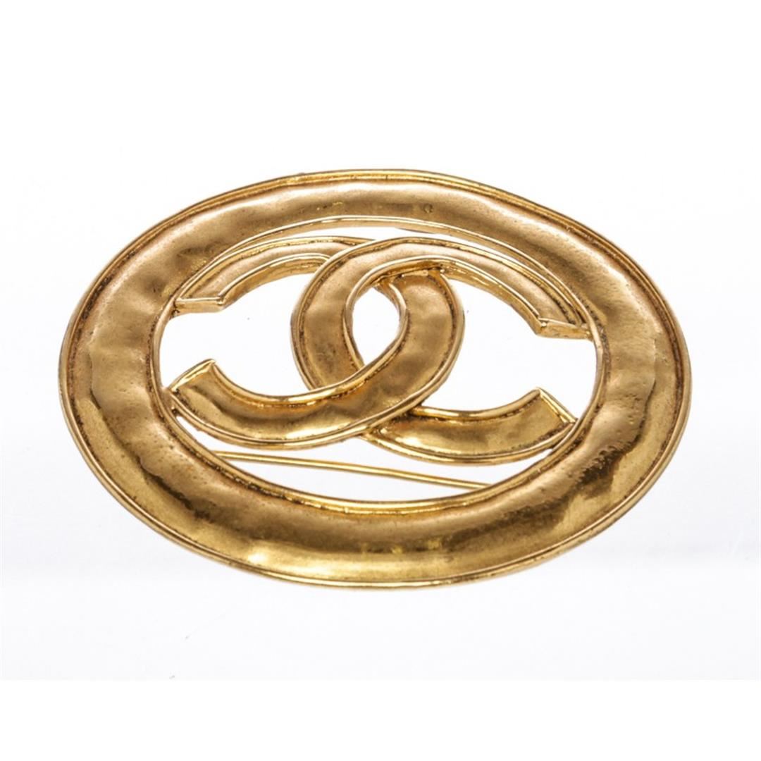 One Chanel Vintage Gold CC Pin Brooch. Gold-tone Chanel CC brooch featuring pin back closure.
