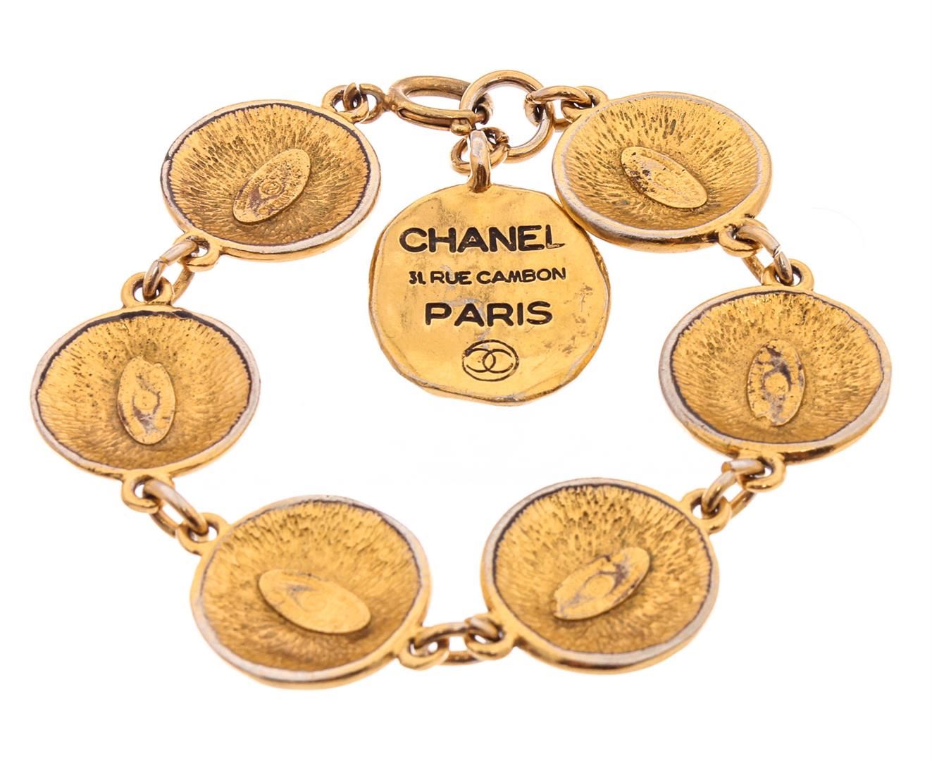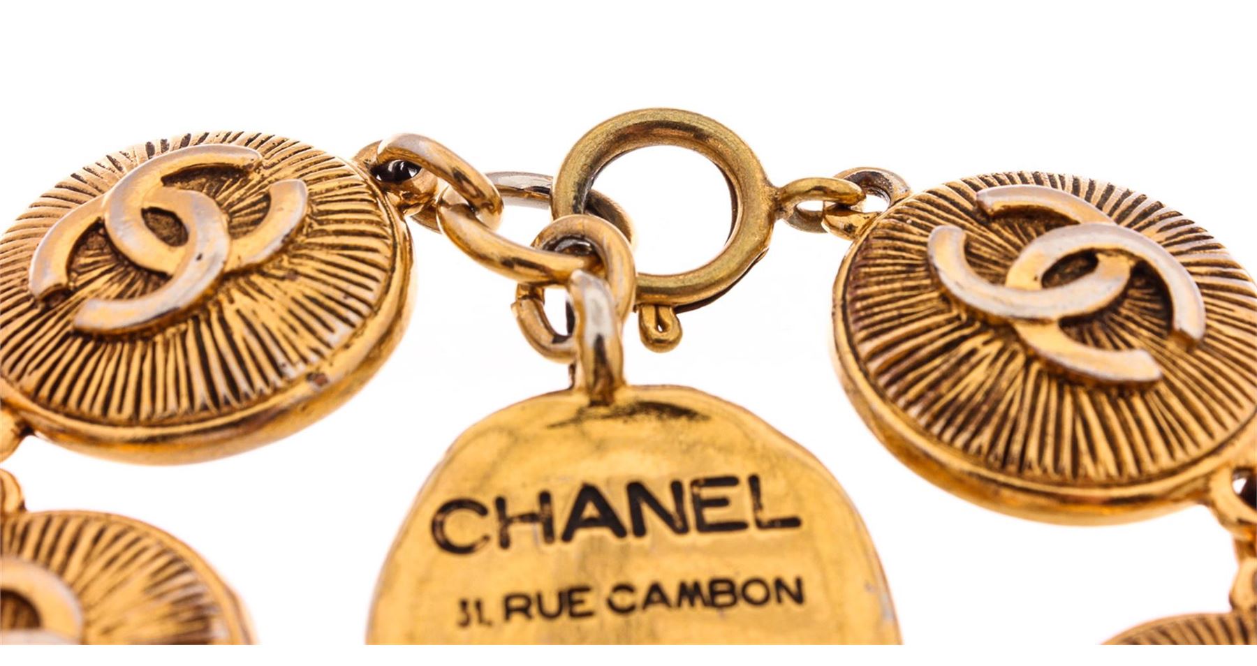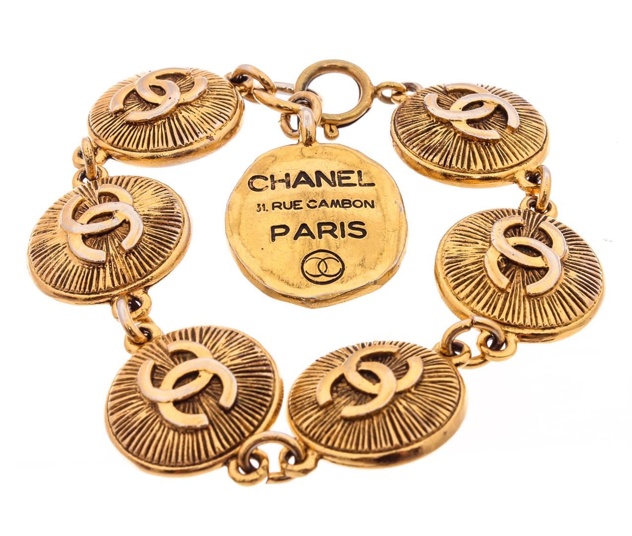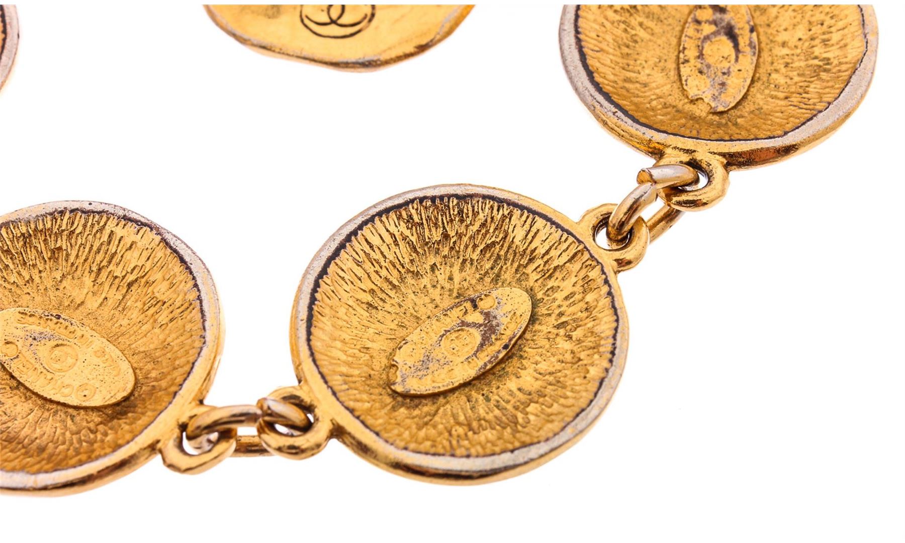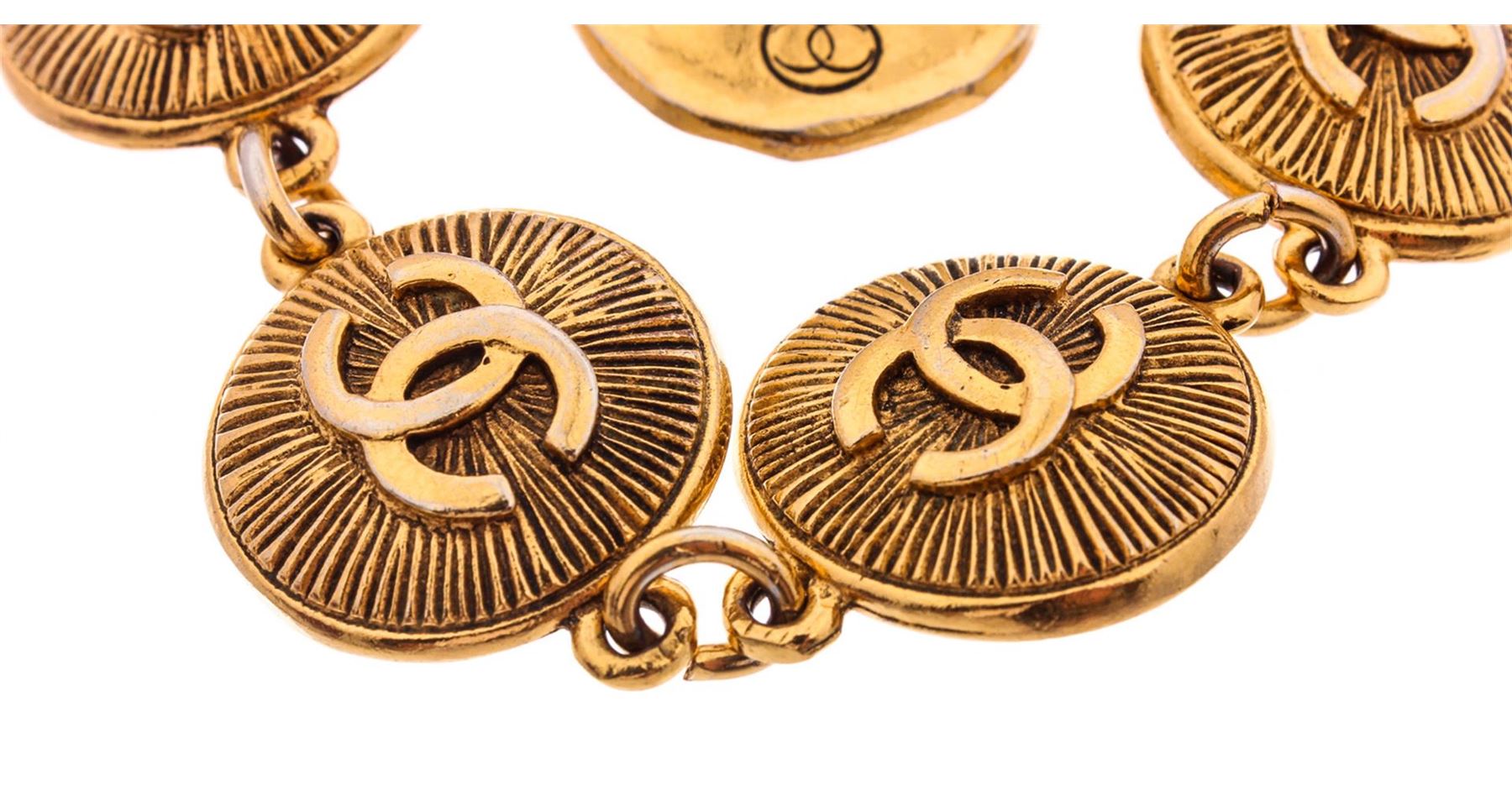 Gold-tone Chanel charm bracelet featuring logo-embossed round burst textured medallion charms and ring-clasp closure.