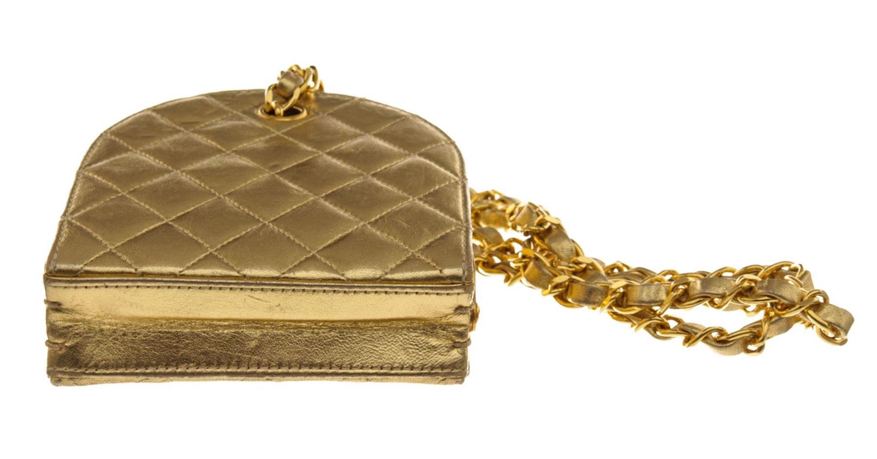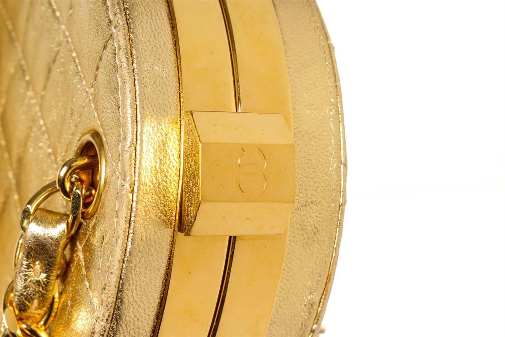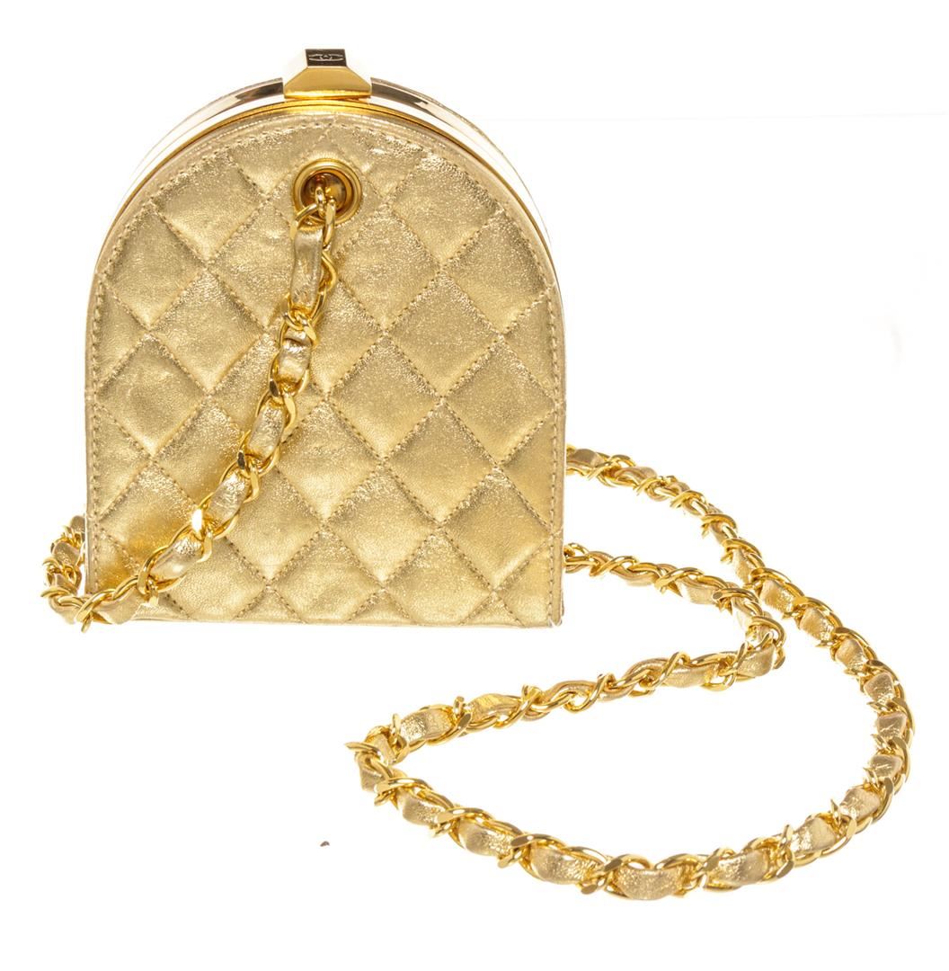 Chanel Vintage Gold Metallic Quilted Leather Frame Mini Clutch Bag. All available information is listed in the description and shown in the photos. Gold metallic quilted leather Chanel Vintage Frame Mini clutch bag with gold-tone hardware, woven chain-link and leather strap, black leather lining and kiss-lock closure at top. Height 5", Width 4.5", Depth 1", Strap Drop 21"