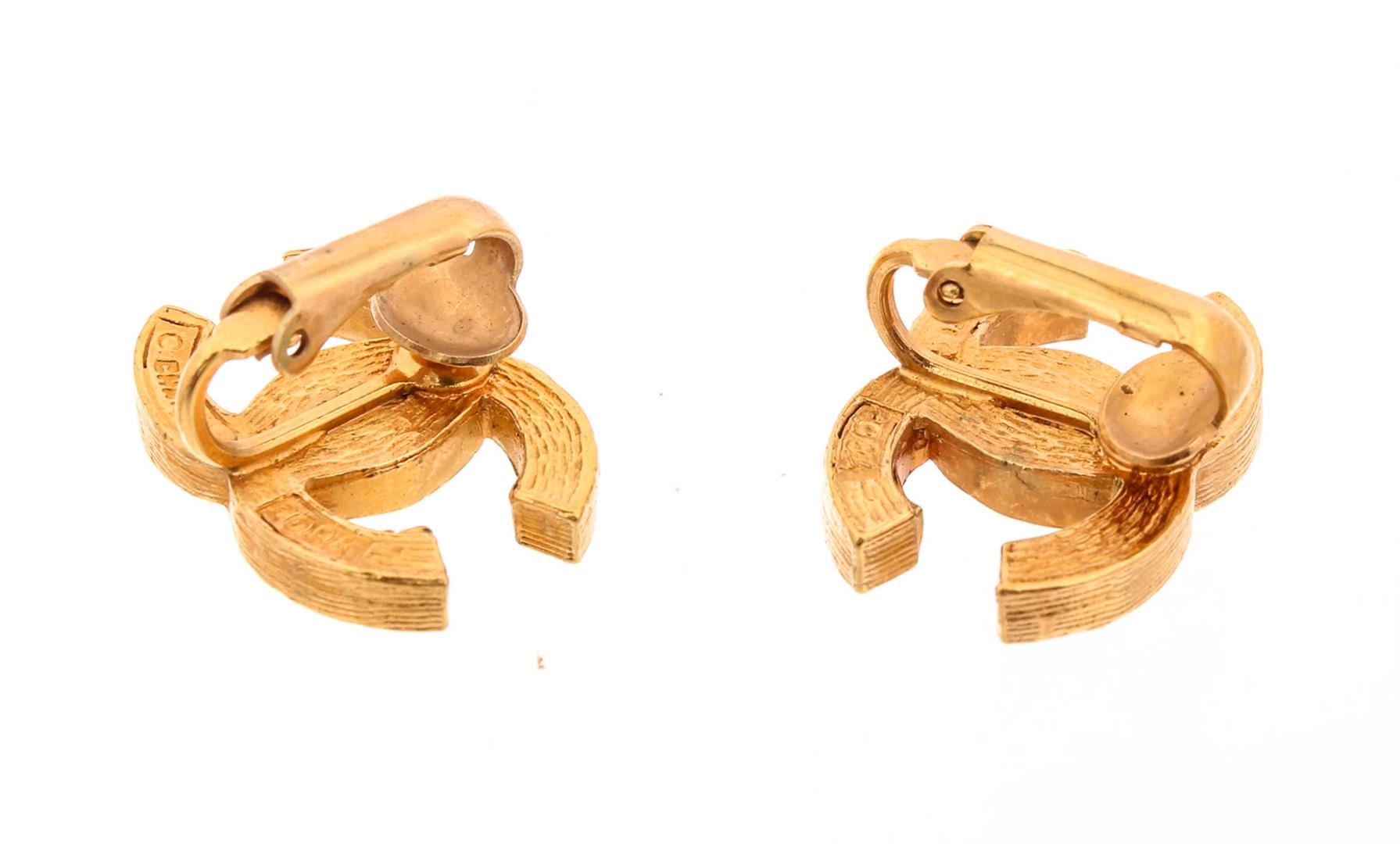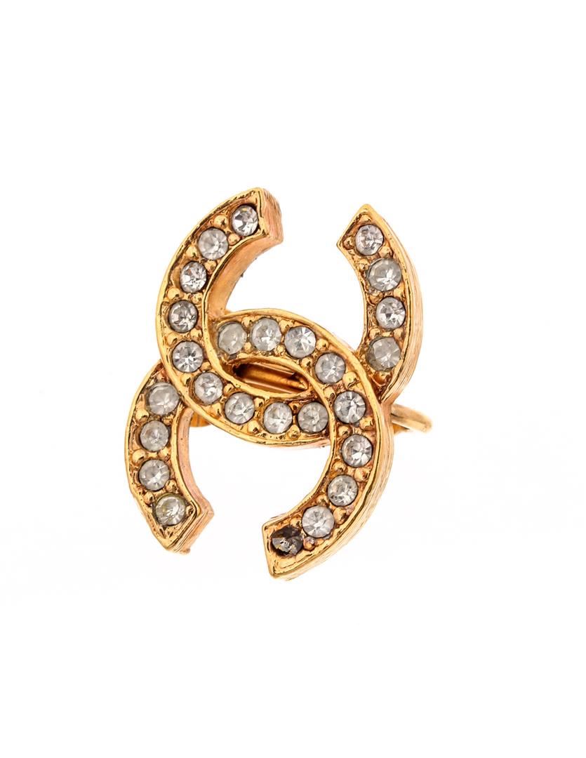 Chanel gold-tone clip on earrings with iconic 'CC" emblem encrusted with rhinestones. Please note: There is one rhinestone missing on the outer corner.