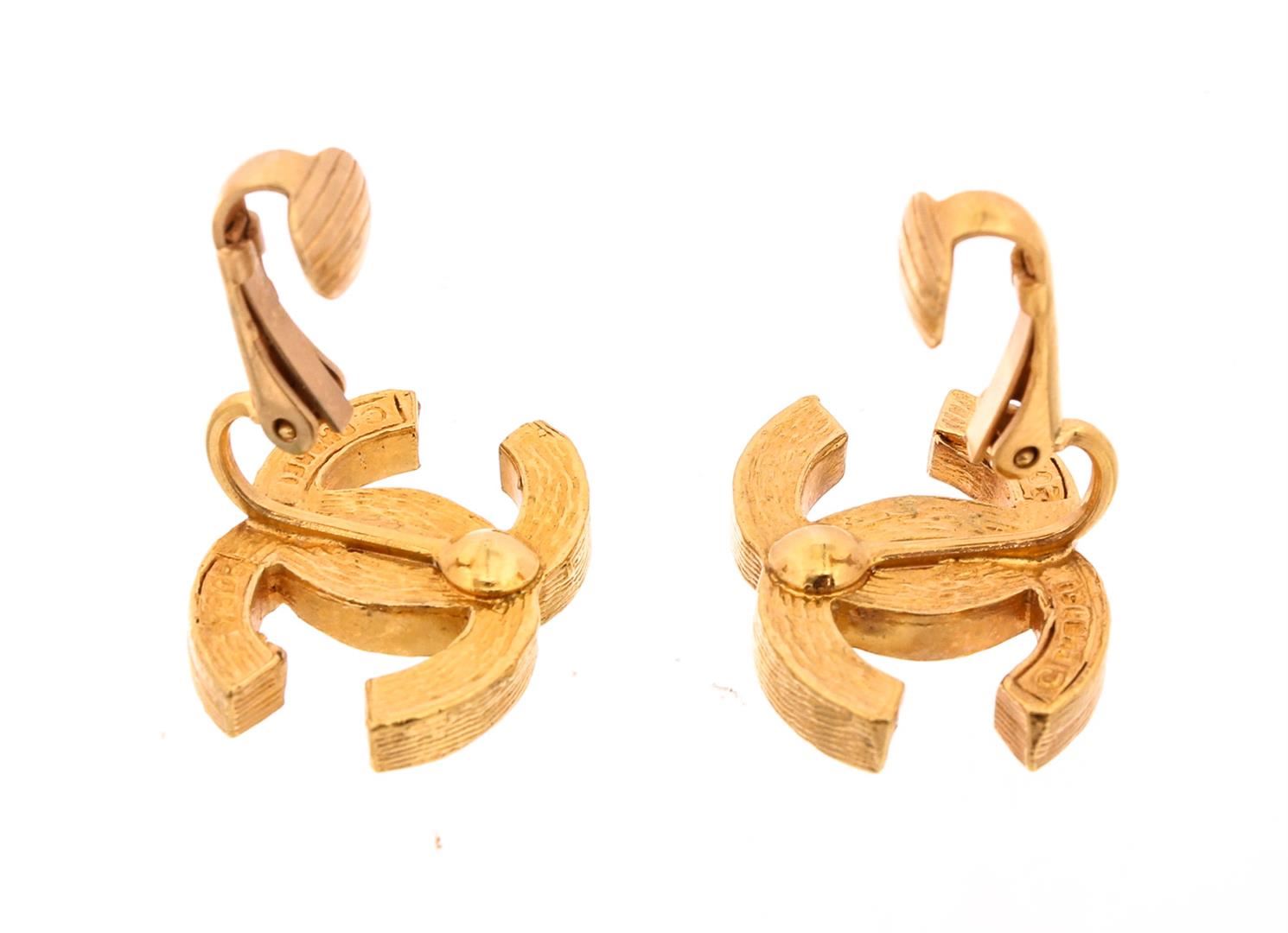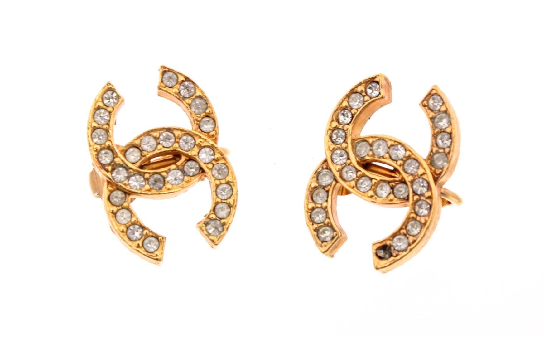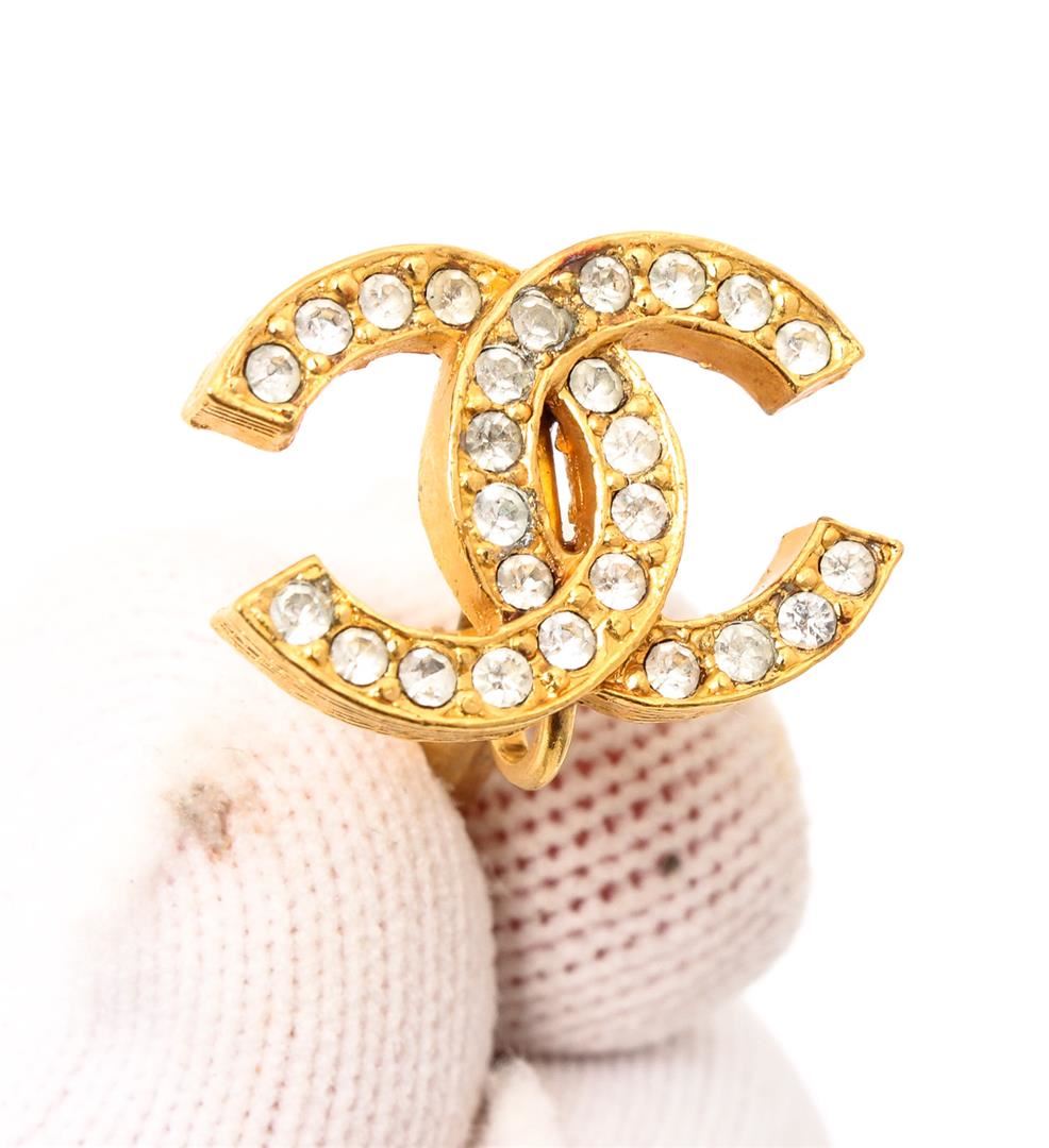 One pair Chanel gold-tone clip on earrings with iconic 'CC" emblem encrusted with rhinestones. Please note: There is one rhinestone missing on the outer corner.