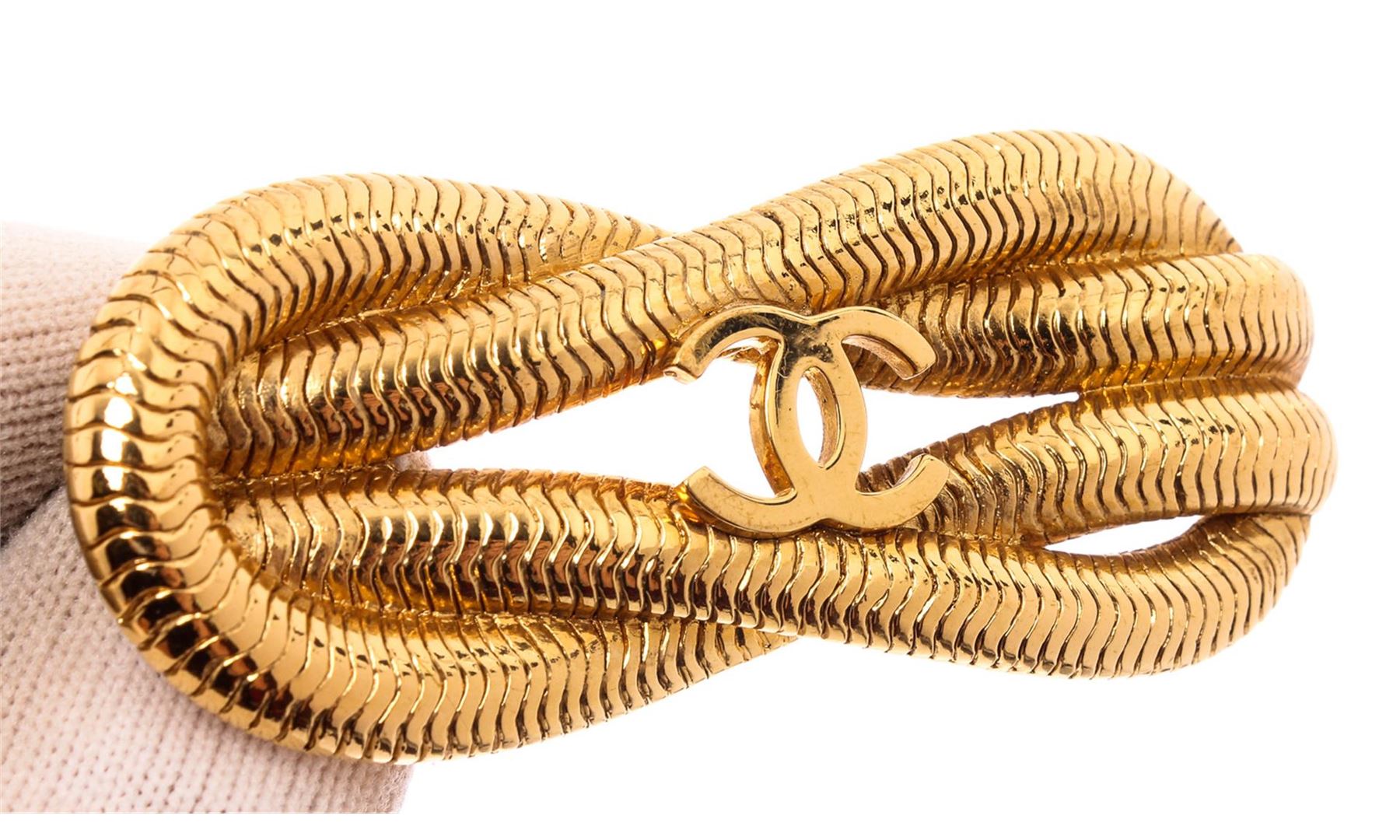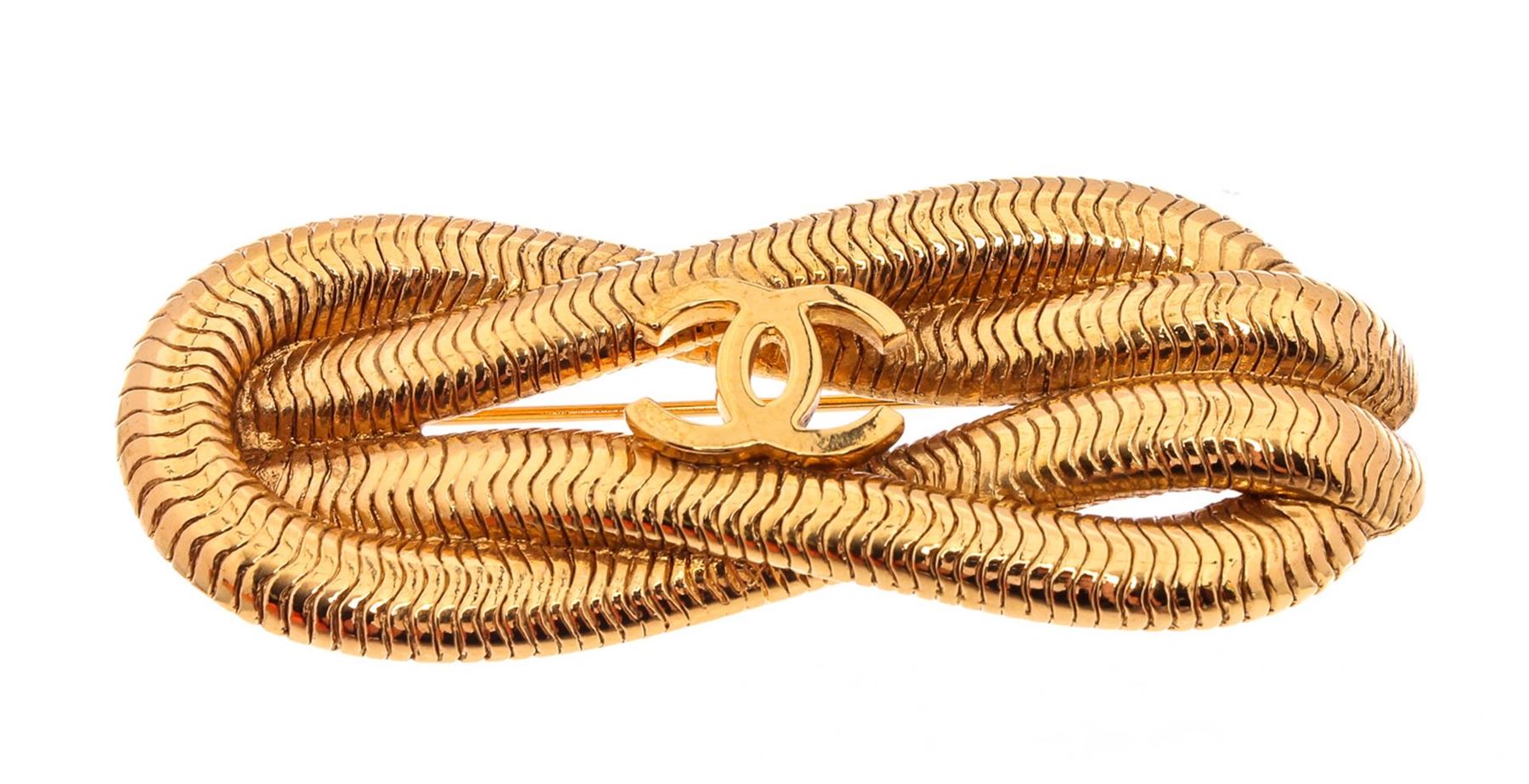 Crafted to resemble a traditional reef knot, this iconic CC motif sits at the centre of the polished gold-tone design. Featuring a signature interlocking CC logo, a twisted detail and a bar pin fastening.