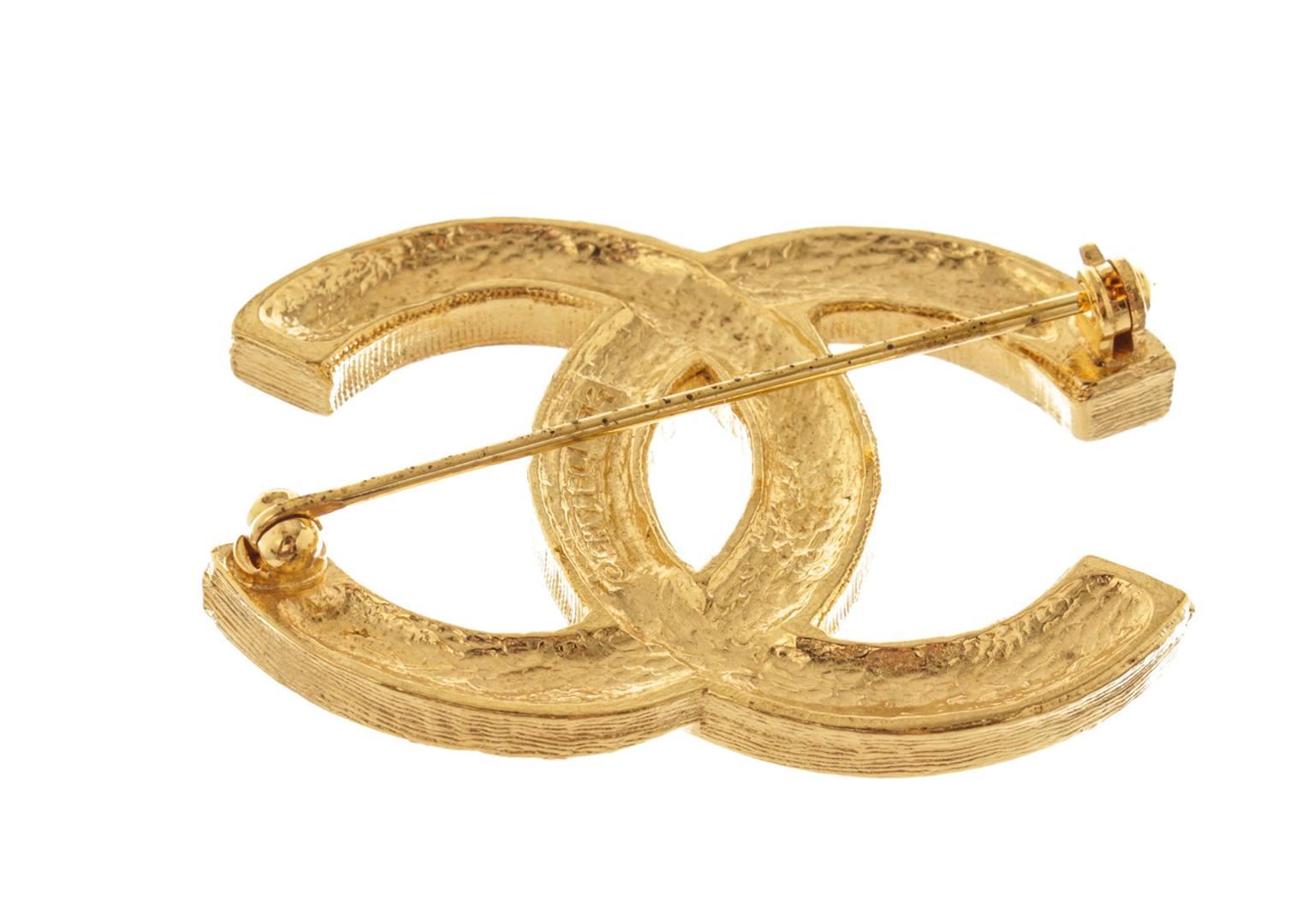 One Chanel Vintage Gold-tone Metal CC Rhinestone Brooch. Item is sold AS-IS. All available information is listed in the description and shown in the photo. Chanel Vintage Gold-tone Metal CC Rhinestone Brooch features CC logo Chanel brooch with rhinestones, gold-tone hardware and safety-pin closure clasp.