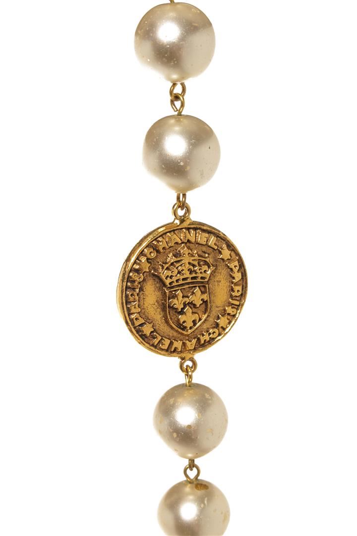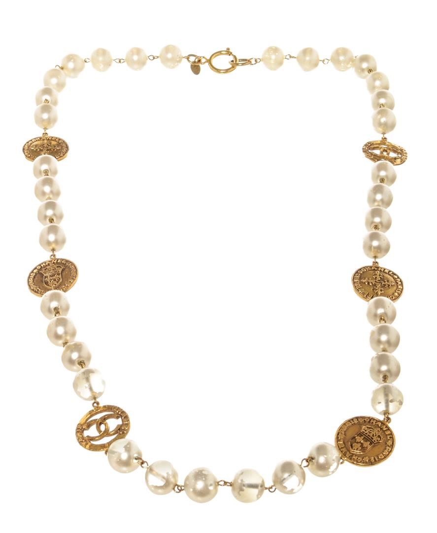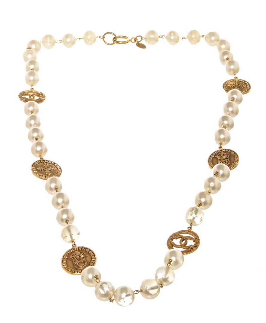 Chanel Vintage Medal C Necklace Gold and Fake Pearl n/a. Brand: Chanel, Style: Vintage Medal C, Type: Necklace, Exterior Color: Gold and Fake Pearl, Closure: springring closure, Length: 1, Width: 1/2/2N/A23, Height: 17. Condition: slight wear on fake pearls. Item is sold AS-IS and all information pertaining to this lot is available in the photos or this description.