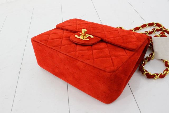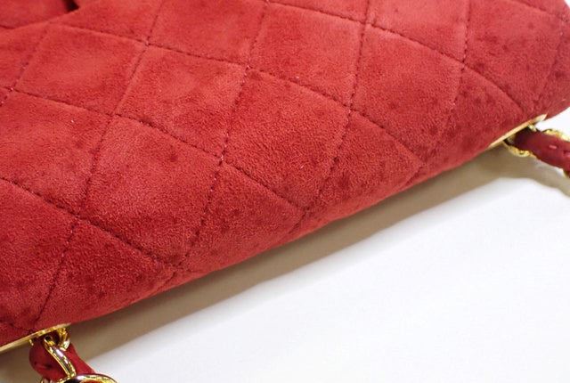 Chanel Vintage Square Mini Flap bag is made with diamond quilted suede in red with gold-tone hardware. The bag features a chain interlaced with leather shoulder strap, a main fold-over top, interlocking CC turn lock closure, back slip pocket and an interi