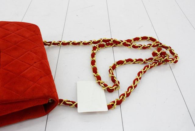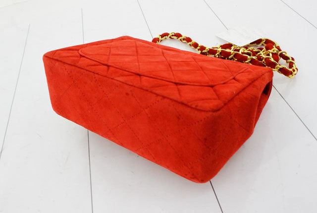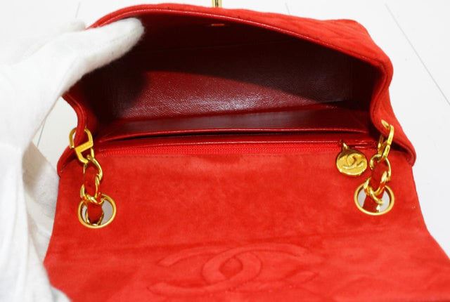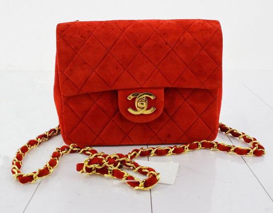 Chanel Vintage Square Mini Flap bag is made with diamond quilted suede in red with gold-tone hardware. The bag features a chain interlaced with leather shoulder strap, a main fold-over top, interlocking CC turn lock closure, back slip pocket and an interi
