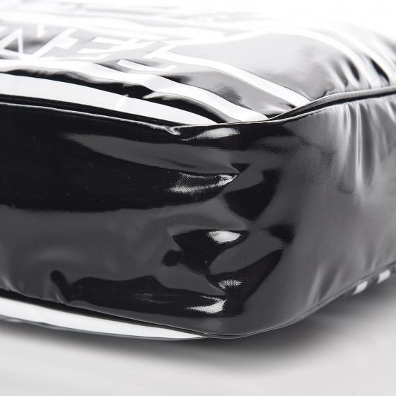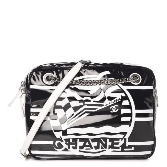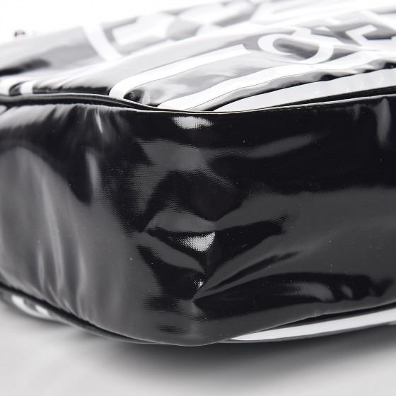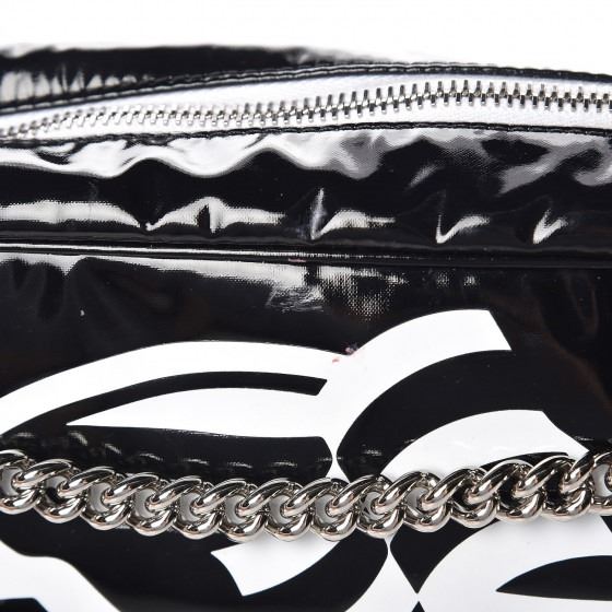 Shoulder bag crafted of black and white vinyl. The bag features a silver chain link with a white leather shoulder strap. The top zipper opens to a black fabric interior with a zipper pocket.