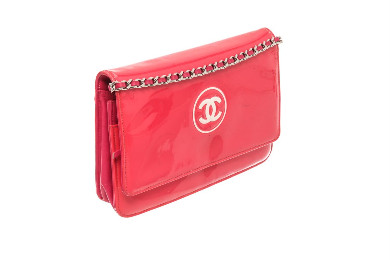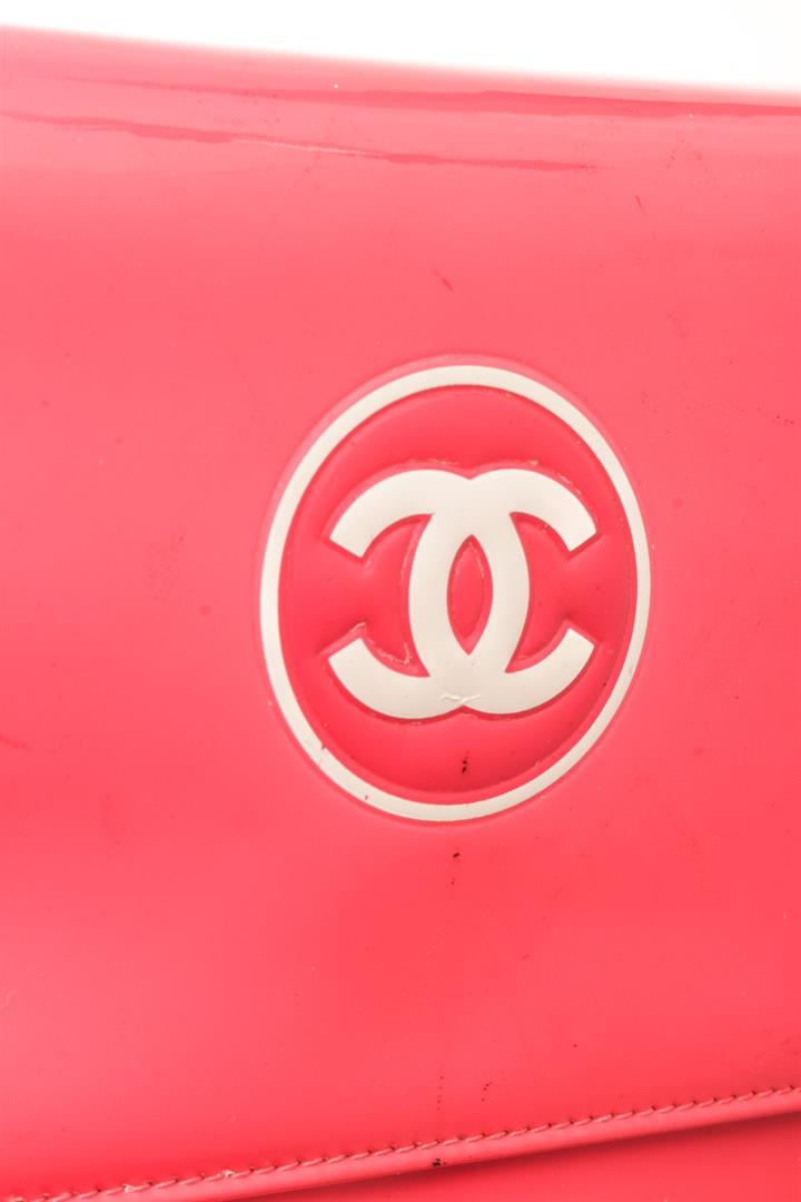 Chanel WOC Crossbody Pink Patent Leather. Brand: Chanel, Style: WOC, Type: Crossbody, Exterior Color: Pink, Exterior Material: Patent Leather, Interior Color: Pink, Interior Material: Leather, Interior Pockets: Two pockets, Closure: SN/Ap Closure, Handle/Strap Type: Chain link strap, Length: 8, Width: 2, Height: 5, Strap Drop: 24. Condition: Pen mark on exterior. Item is sold AS-IS and all information pertaining to this lot is available in the photos or this description.