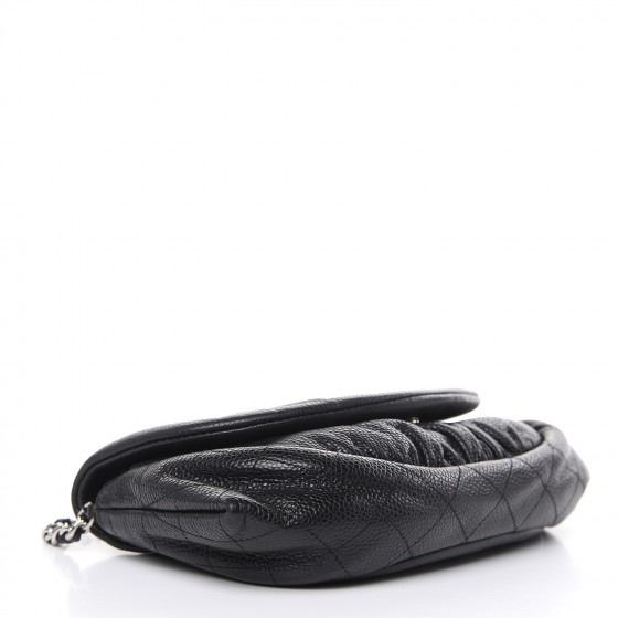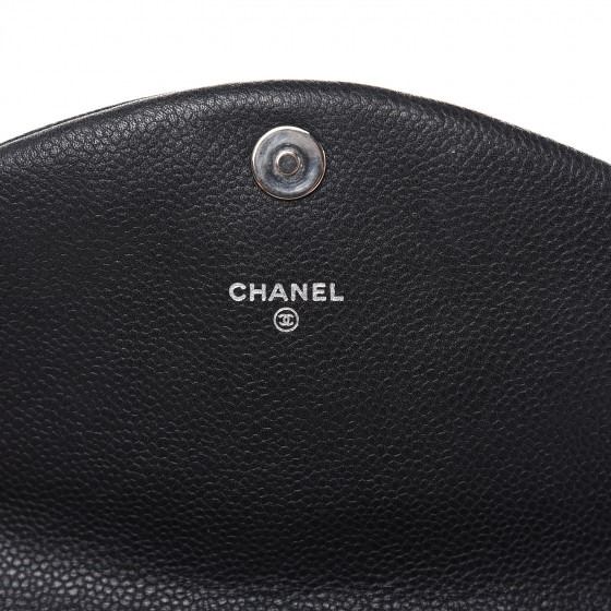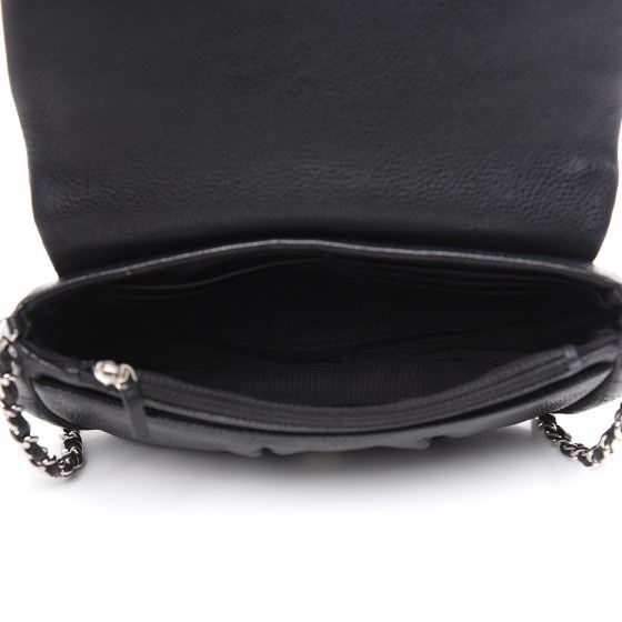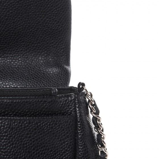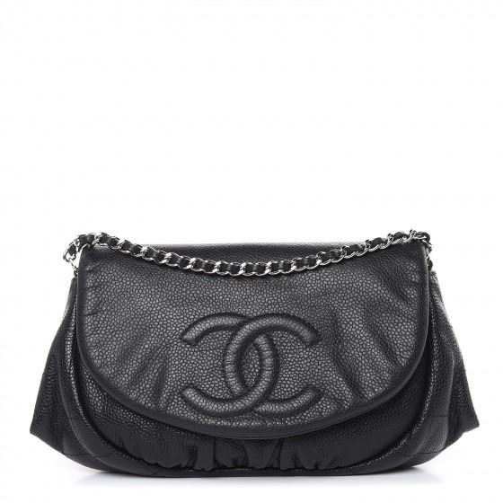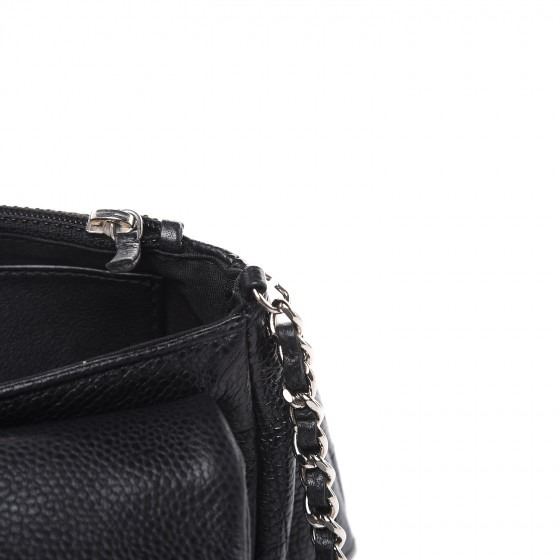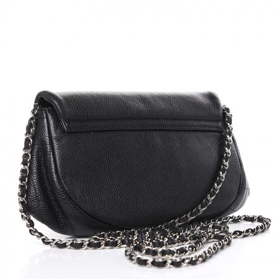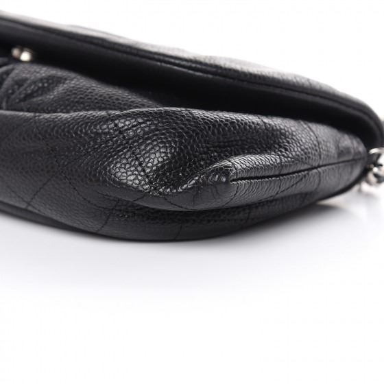 CHANEL Caviar Half Moon Wallet On Chain WOC crafted of pleated luxurious caviar leather in classic black. The crossbody bag features a below the waist polished silver chain link shoulder strap threaded with black leather and a front flap with a quilted Chanel CC logo. The flap opens to an expansive black fabric interior with card slots, zipper, and patch pockets.