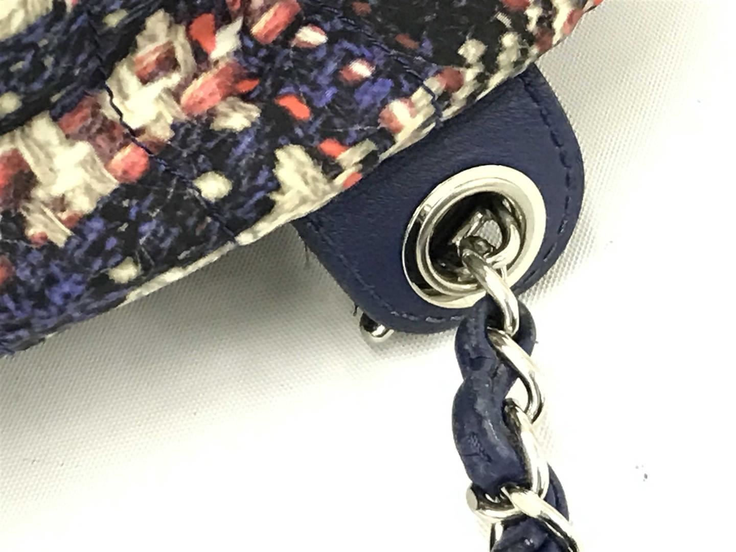 This stylish backpack is beautifully crafted, reflecting a tightly woven blue, red and white tweed fabric. It features blue leather shoulder straps and a frontal flap secured with a silver-tone interlocking CC turn lock. This opens to an open top, secured