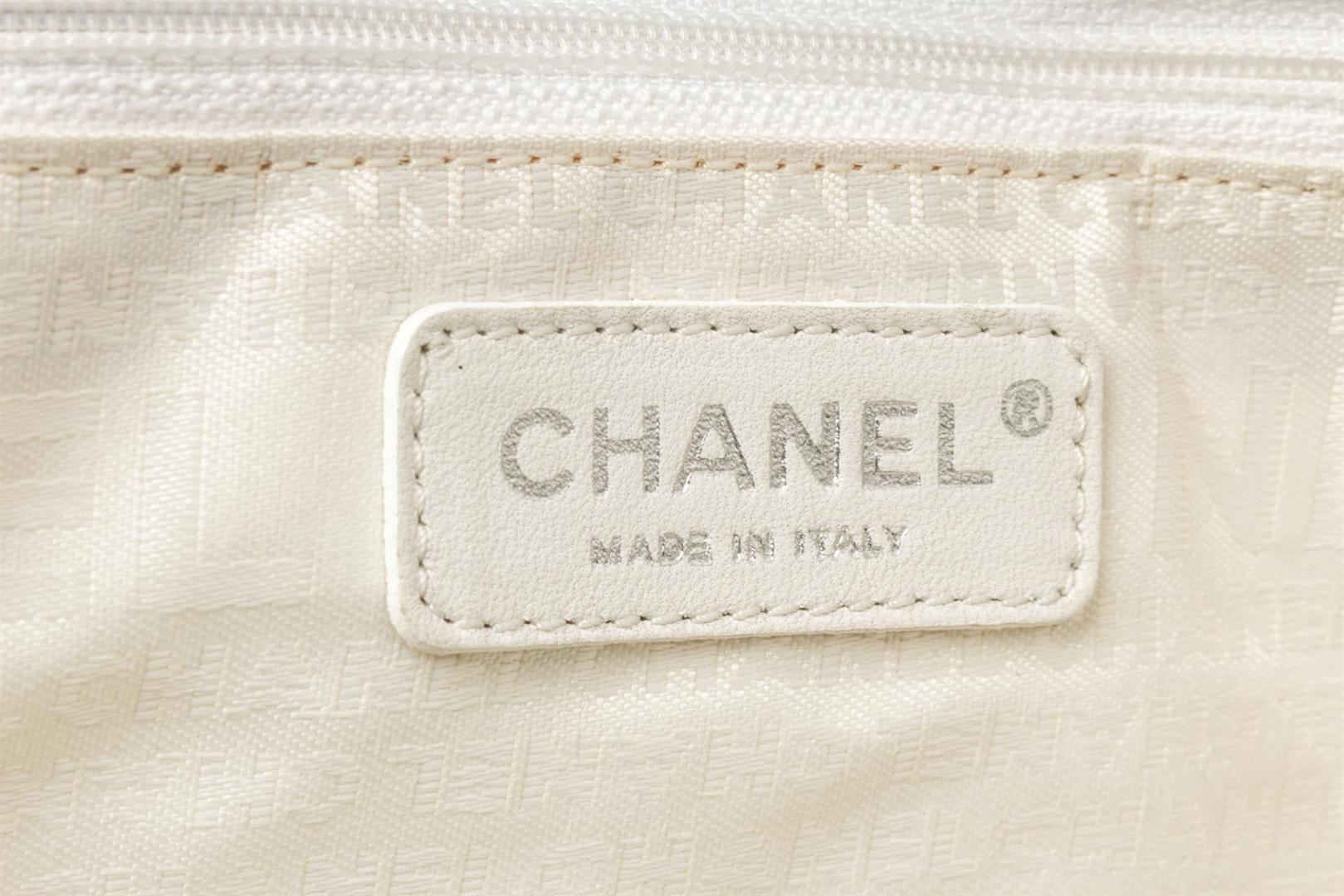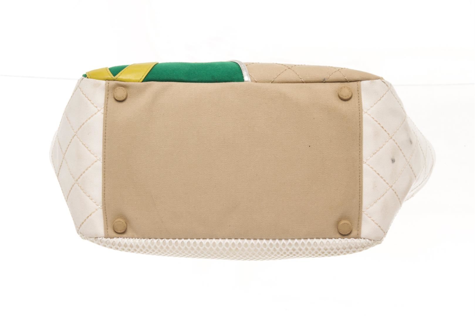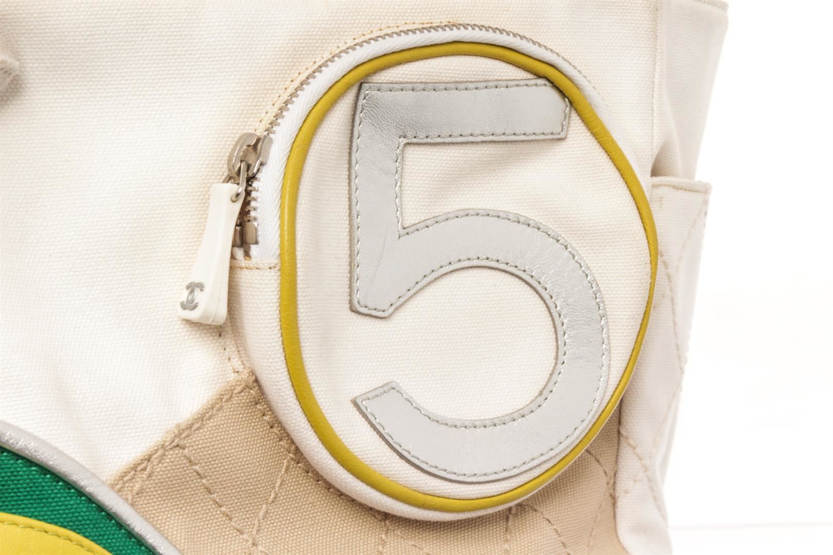 Chanel White Canvas No 5 Sport Shoulder Bag. All available information is listed in the description and shown in the photos. chanel white canvas no 5 sport shoulder bag with leather trim front zip pocket, side pockets and mesh back back pocket, leather woven silver tone chain handles,interior zip pocket. no rip,no tear,no holes.