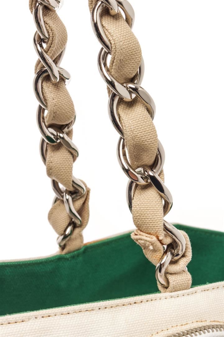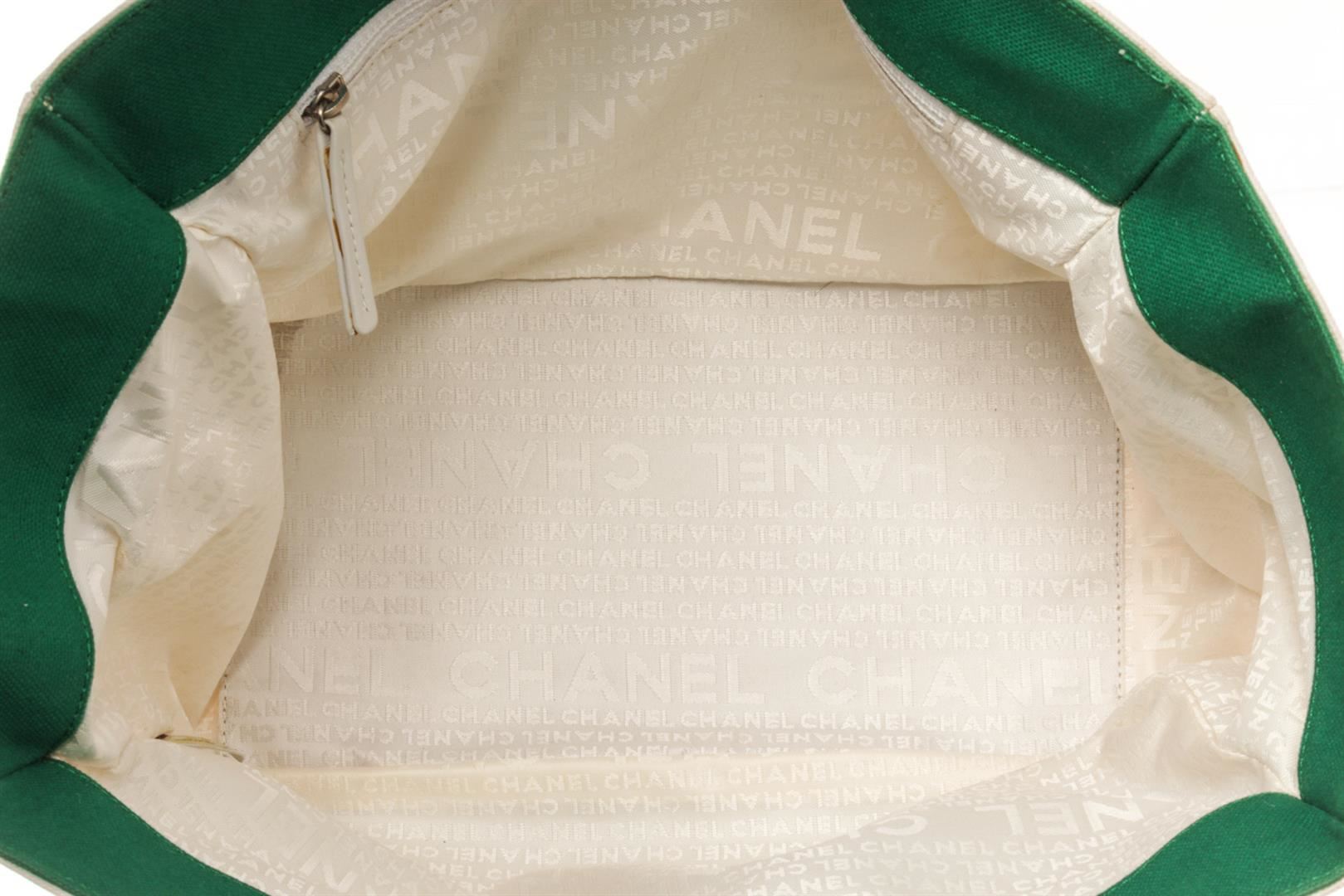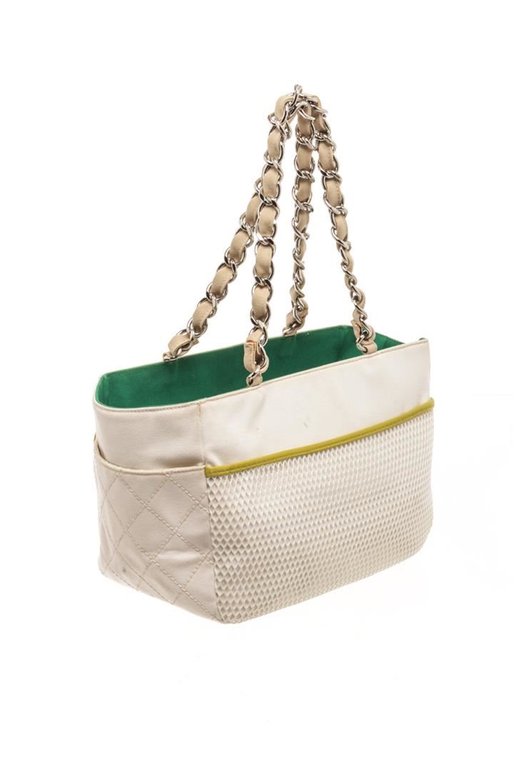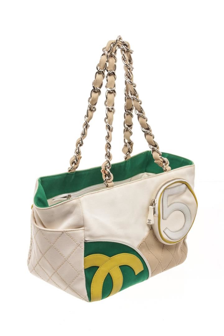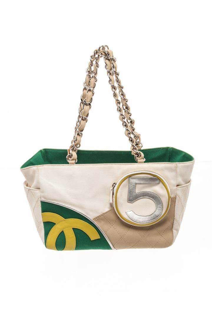 Chanel White Canvas No 5 Sport Shoulder Bag. All available information is listed in the description and shown in the photos. chanel white canvas no 5 sport shoulder bag with leather trim front zip pocket, side pockets and mesh back back pocket, leather woven silver tone chain handles,interior zip pocket. no rip,no tear,no holes.