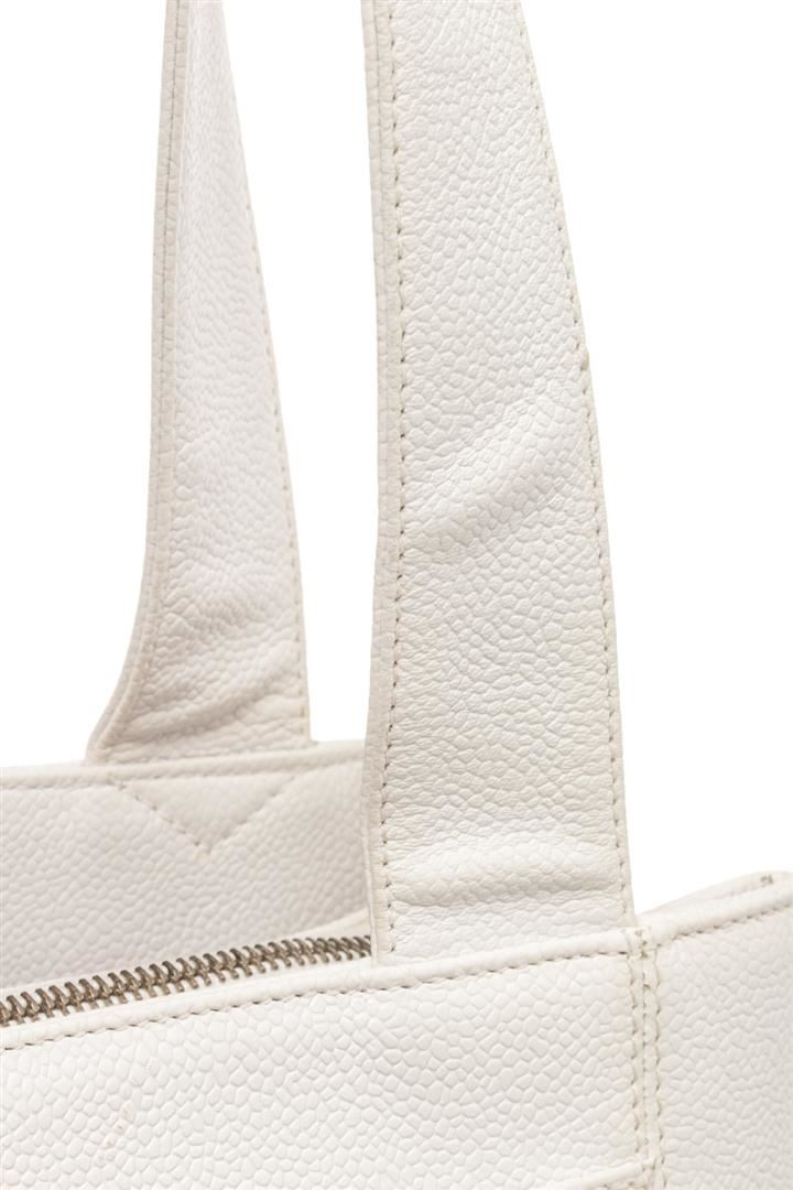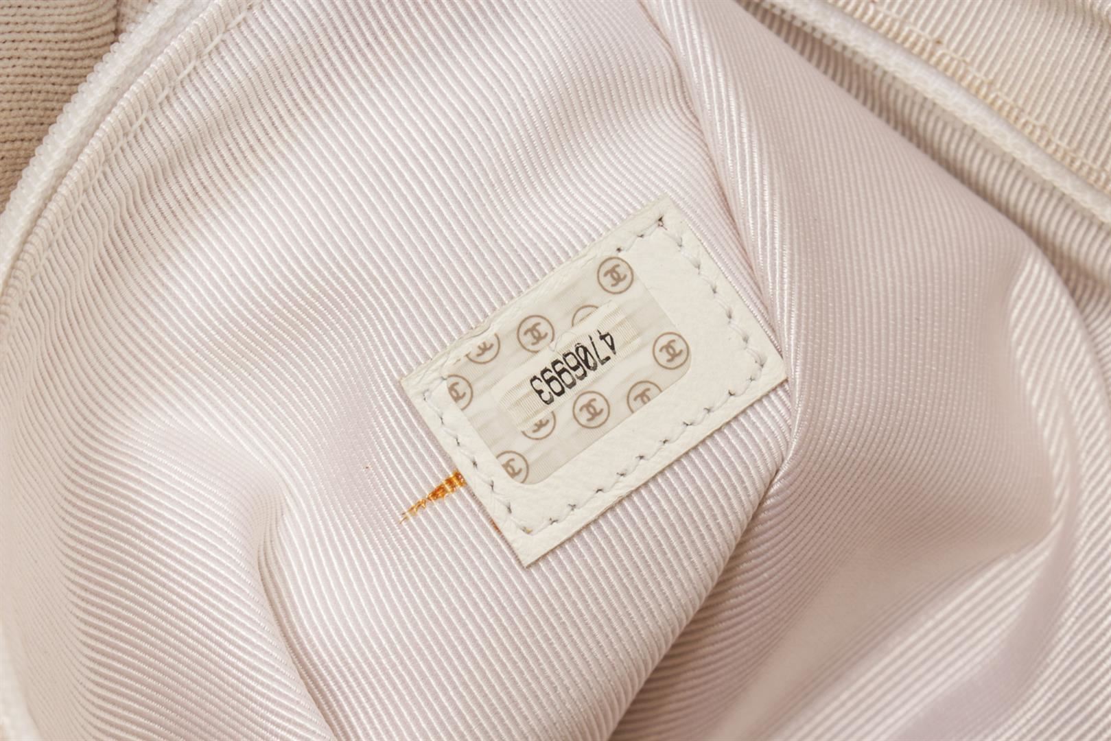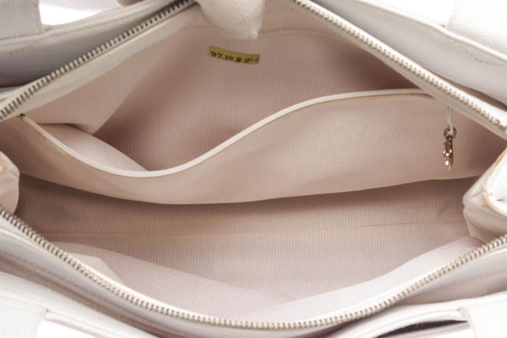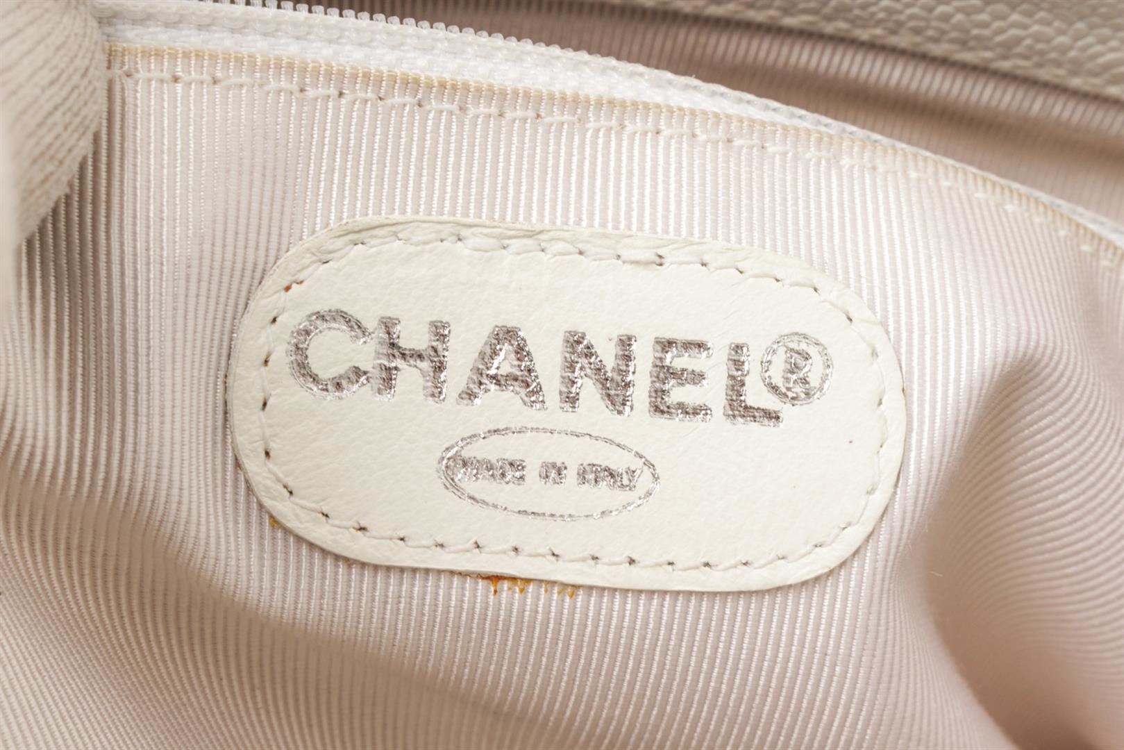 Chanel White Caviar Leather Tote Bag. All available information is listed in the description and shown in the photos. Chanel White Caviar Leather Tote Bag with double flat leather handles, two exterior slip pockets, white fabric lined interior with two zip pockets, and gold tone hardware, embroidered on the front side, three compartments: two open and one middle compartment with top zip closure.