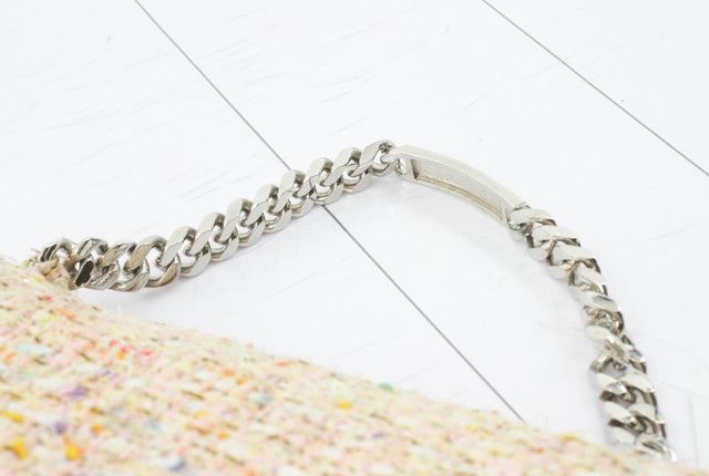 Chanel White Multicolor Fantasy-weave Shimmer Tweed Silver Logo Handbag. Please see photos and description for all available information! This Chanel handbag features white background with multicolor fantasy-weave shimmer tweed exterior, silver-tone chain