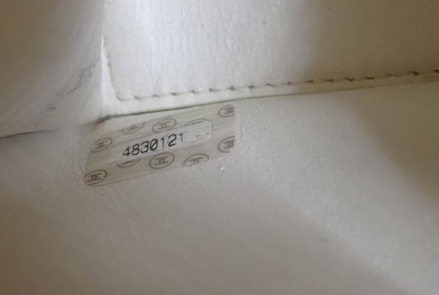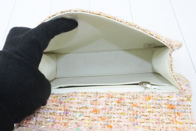 One Chanel White Multicolor Fantasy-weave Shimmer Tweed Silver Logo Handbag. Item is sold AS-IS. All available information is listed in the description and shown in the photo. This Chanel handbag features white background with multicolor fantasy-weave shimmer tweed exterior, silver-tone chain handle, flap with large silver interlocking CC leather logo applique, concealed magnetic closure, gusseted sides, white leather interior lining, single slip pocket, and wall zip pocket.