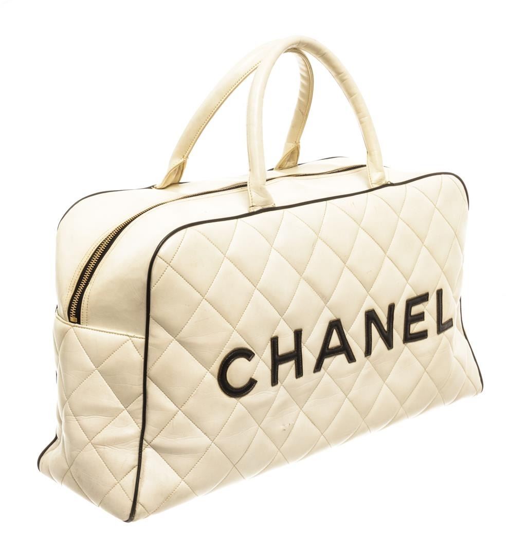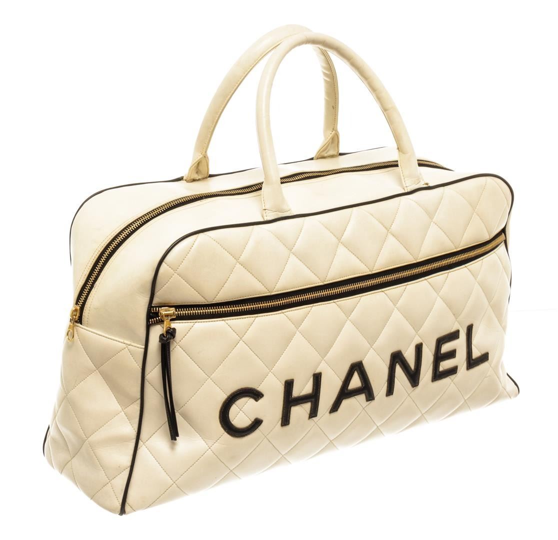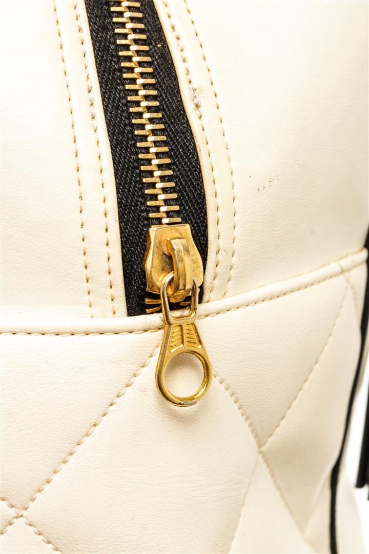 Chanel White Quilted Bowling Bag. All available information is listed in the description and shown in the photos. Chanel White Quilted Bowling Bag features gold-tone hardware, black leather lining and trim, zip pocket on the interior and exterior, with two white leather top handles and top zip closure.