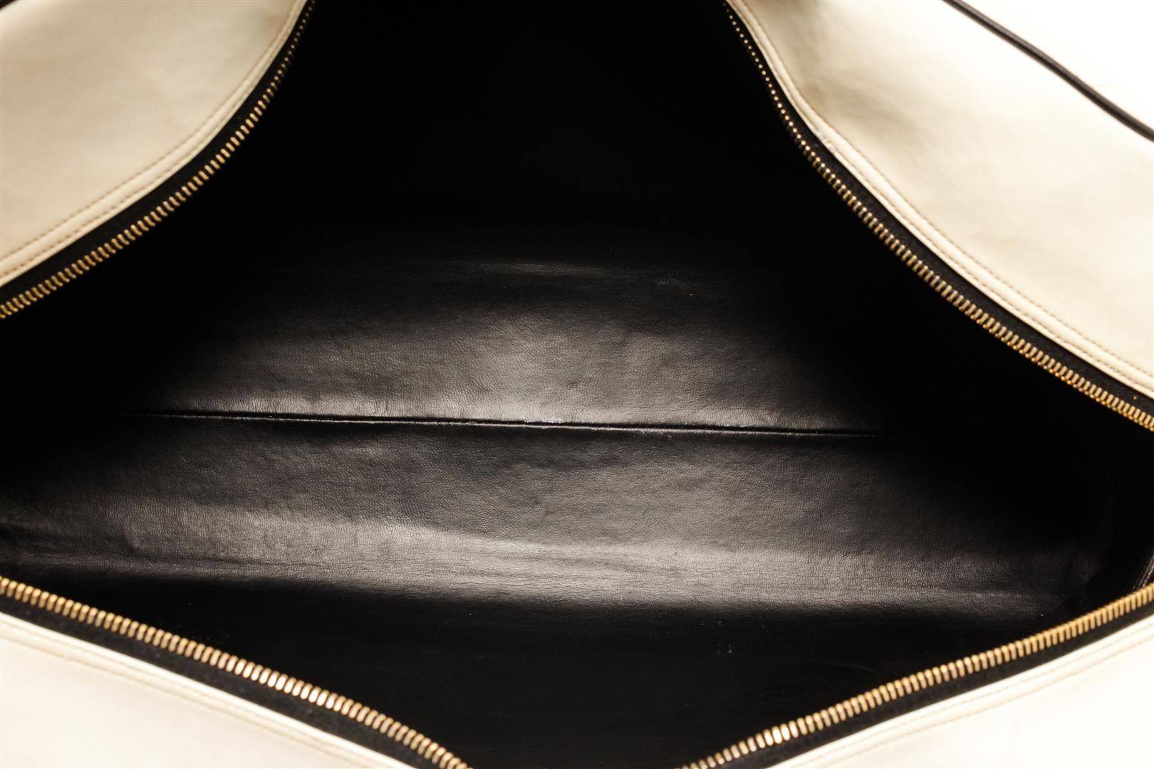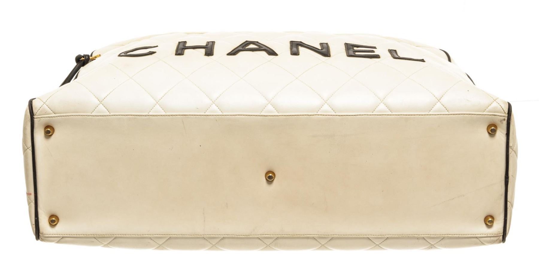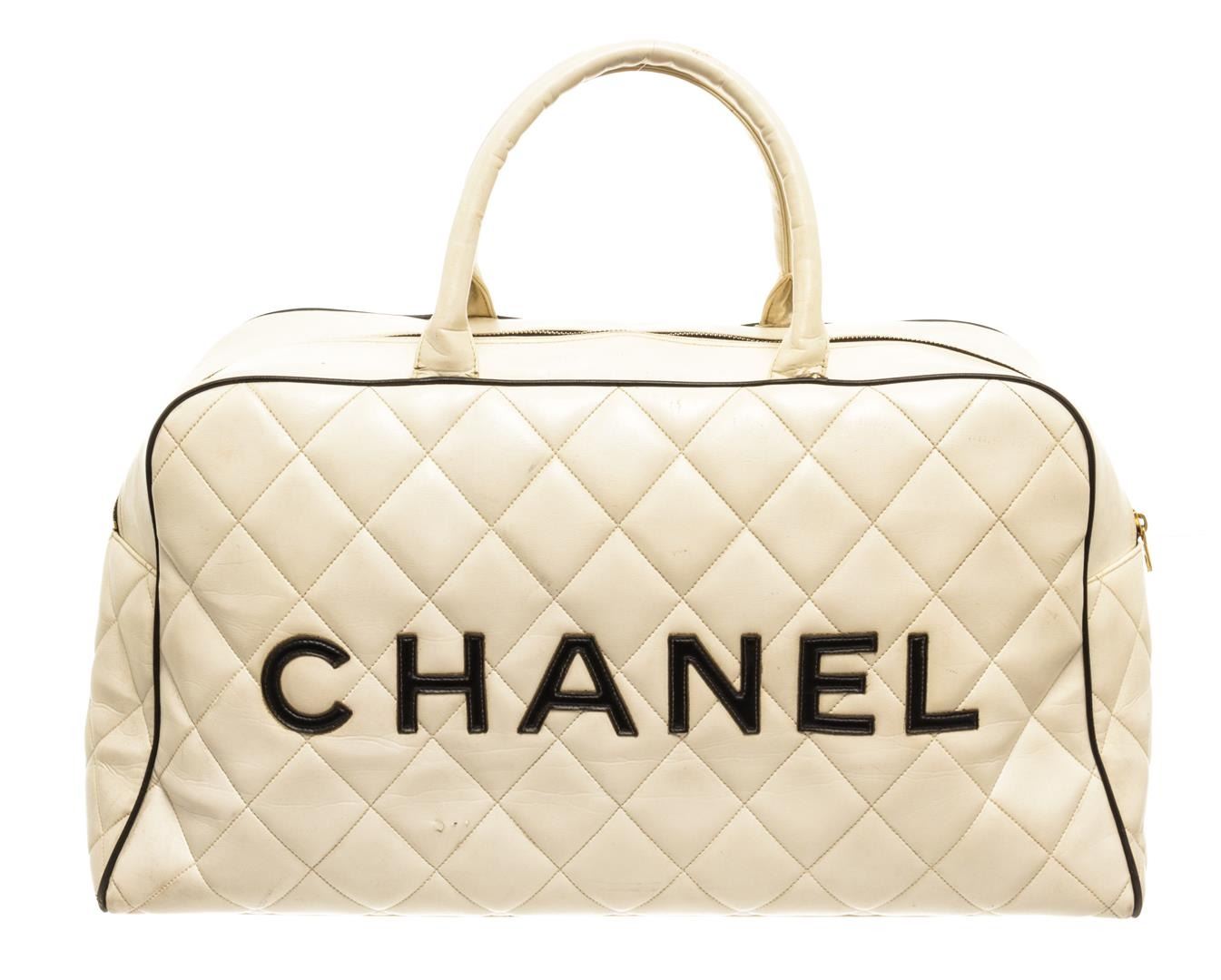 Chanel White Quilted Bowling Bag. All available information is listed in the description and shown in the photos. Chanel White Quilted Bowling Bag features gold-tone hardware, black leather lining and trim, zip pocket on the interior and exterior, with two white leather top handles and top zip closure.