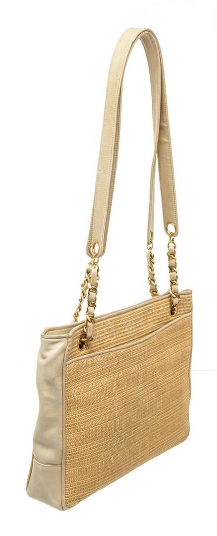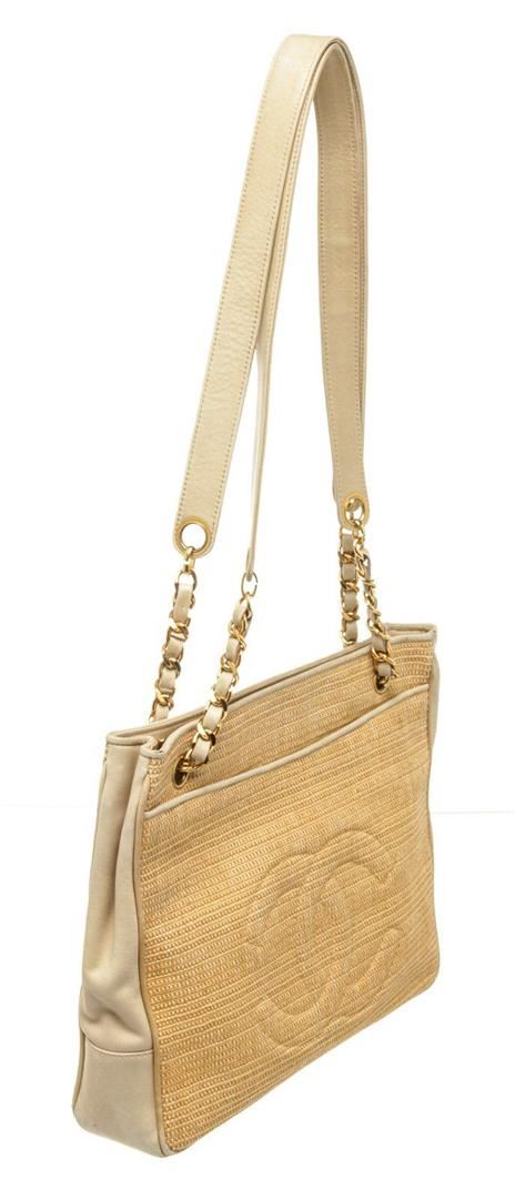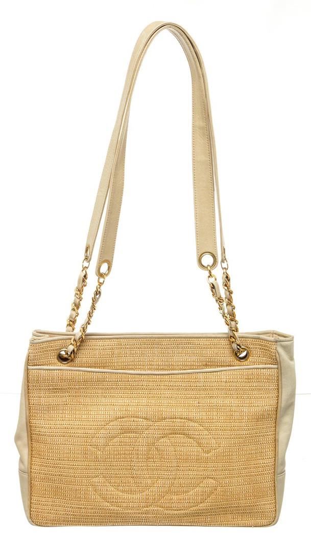 Chanel Yellow CC Raffia Chain Shoulder Bag with leather, gold-tone hardware, interior zip pocket, chain shoulder strap and flap closure.