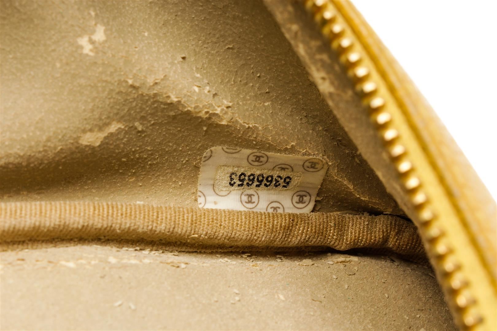 Chanel Yellow Caviar Leather Small CC Vanity Cosmetic Bag. All available information is listed in the description and shown in the photos. Chanel Yellow Caviar Leather Small CC Vanity Cosmetic Bag with featuring a top handle, an all around zip fastening, a front embossed logo stamp, gold-tone hardware, an internal mirror, an internal logo patch and a white lining. Height: 2.8" Width: 5.9" Depth: 3.1", Handle Drop: 0.6" / 7 x 15 x 8 Cm