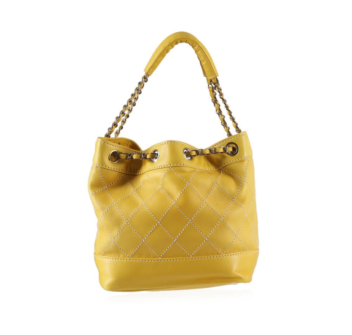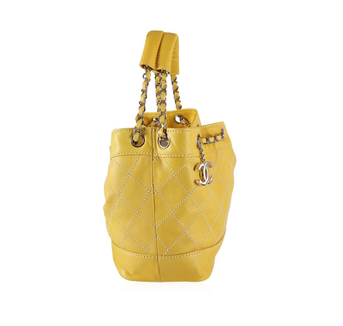One Chanel yellow drawstring bag in good condition, measuring approximately 11 inches wide by 8.75 inches tall. Features a zippered pouch inside and comes with a Chanel drawstring cover bag, box, and card of authenticity.