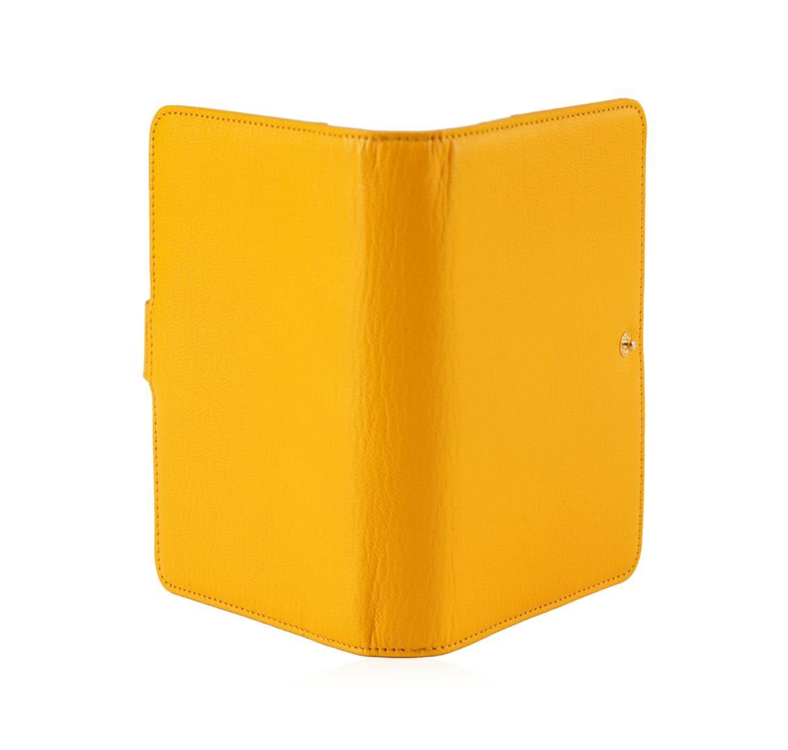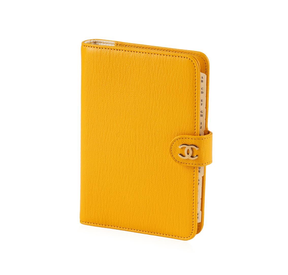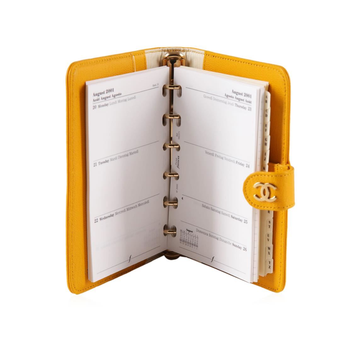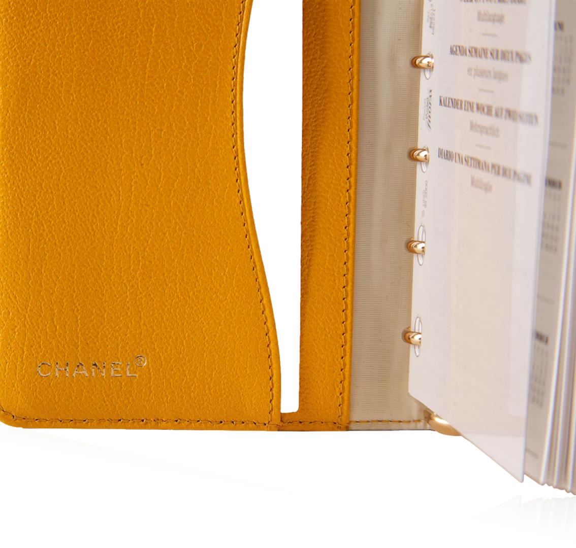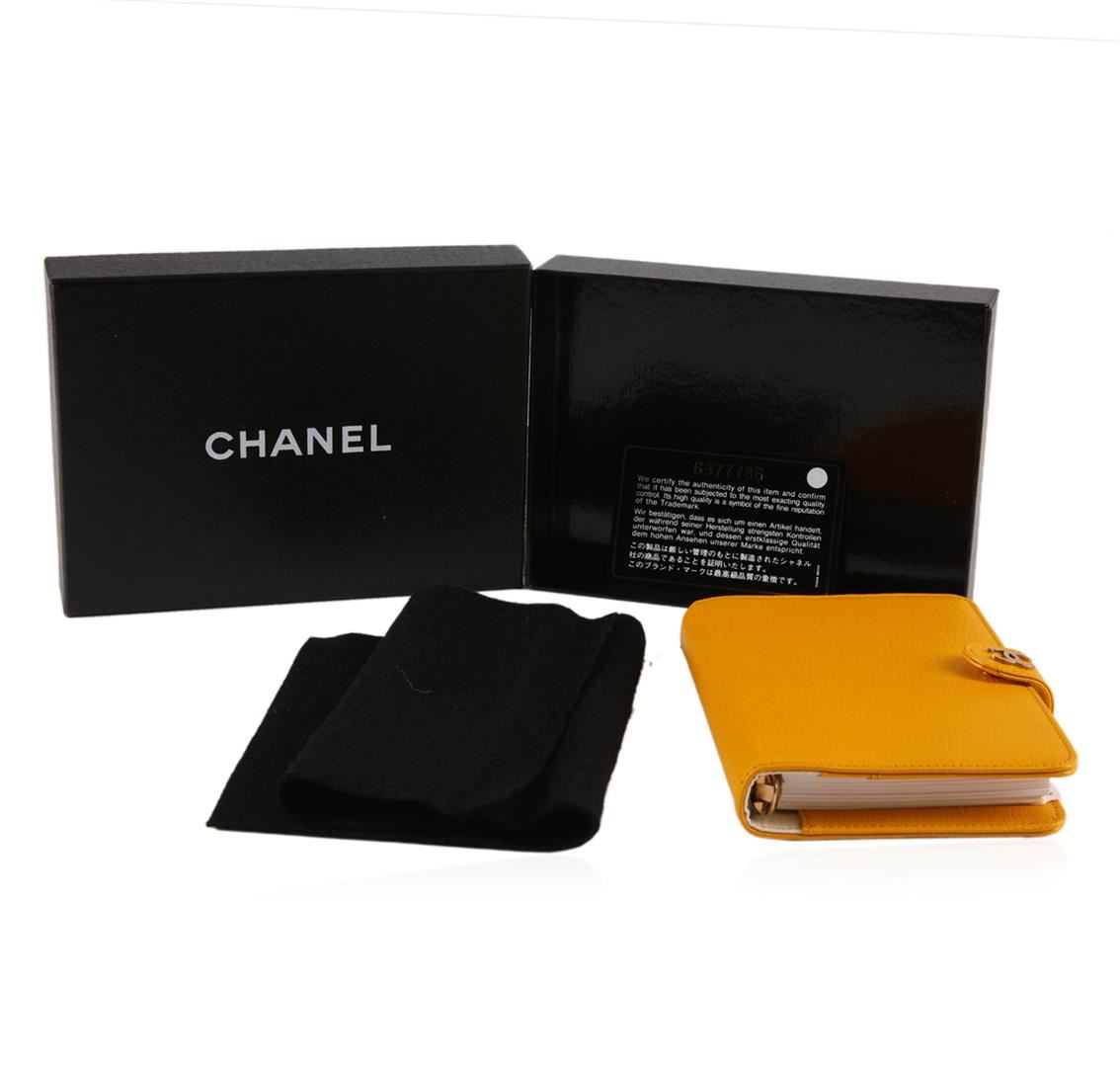 One Chanel yellow leather notebook, measuring 10.5 by 14 by 2 centimeters. The notebook has not been written in and is in good condition. The notebook features three slots and a pen holder for ease of use. Comes with a Chanel box and card of authenticity