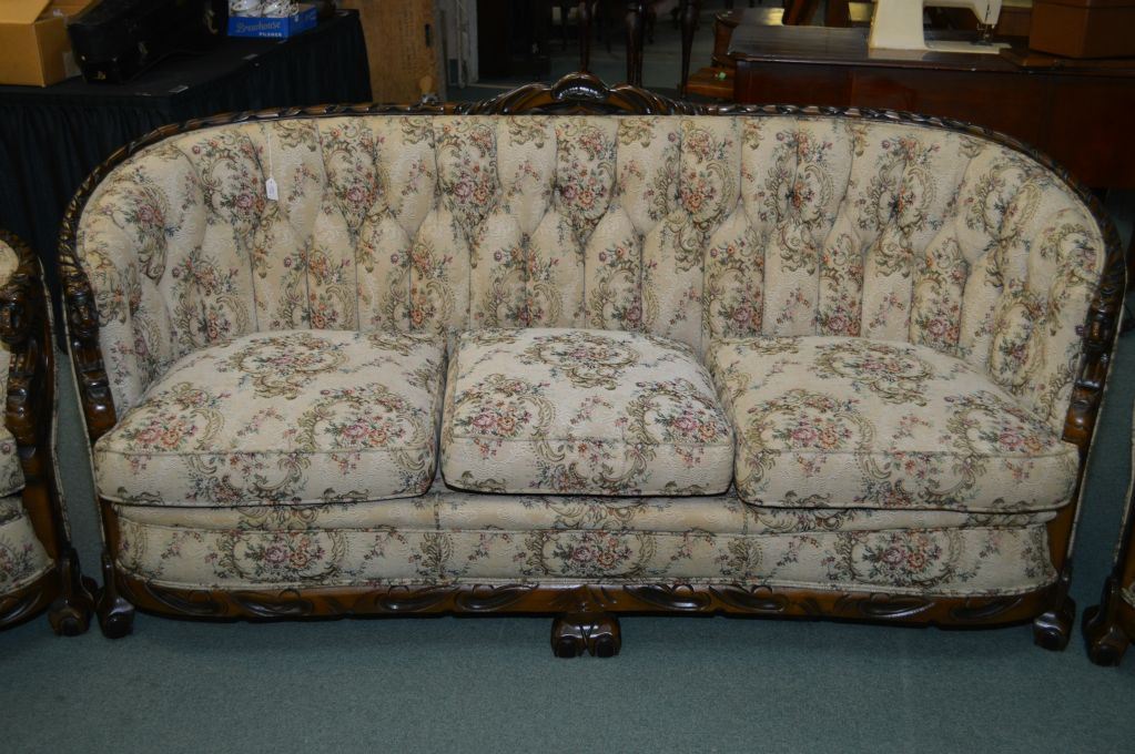 Chanel and button tufted upholstered parlour suite including full sized sofa and two arm chairs each with carved show wood including lion head motif arms and paw feet in tapestry fabric
