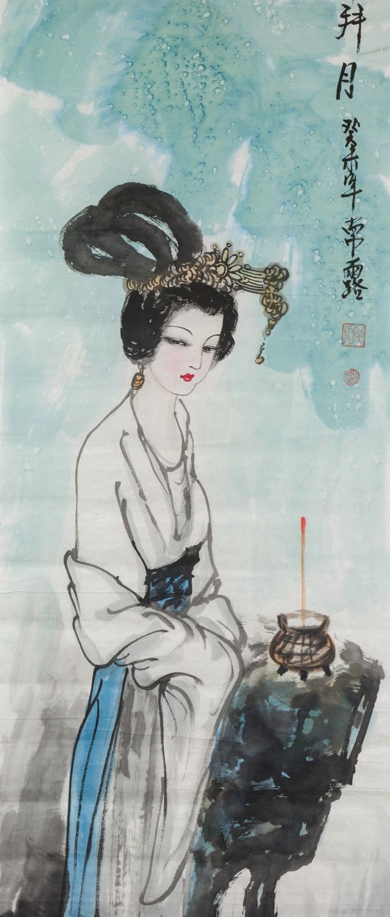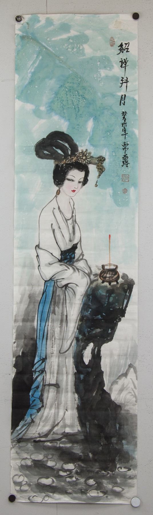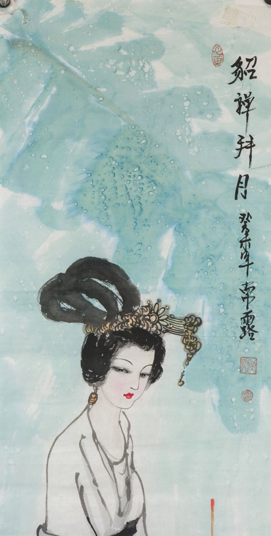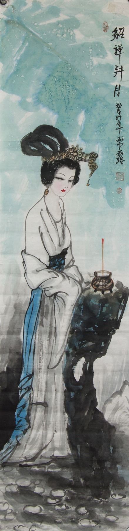 Painting of Diao Chan, one the most beautiful women in ancient China; Chinese ink and watercolour on paper; signed Chang Lu, 20th century; inscribed with 3 artist seals; 136 cm x 35 cm