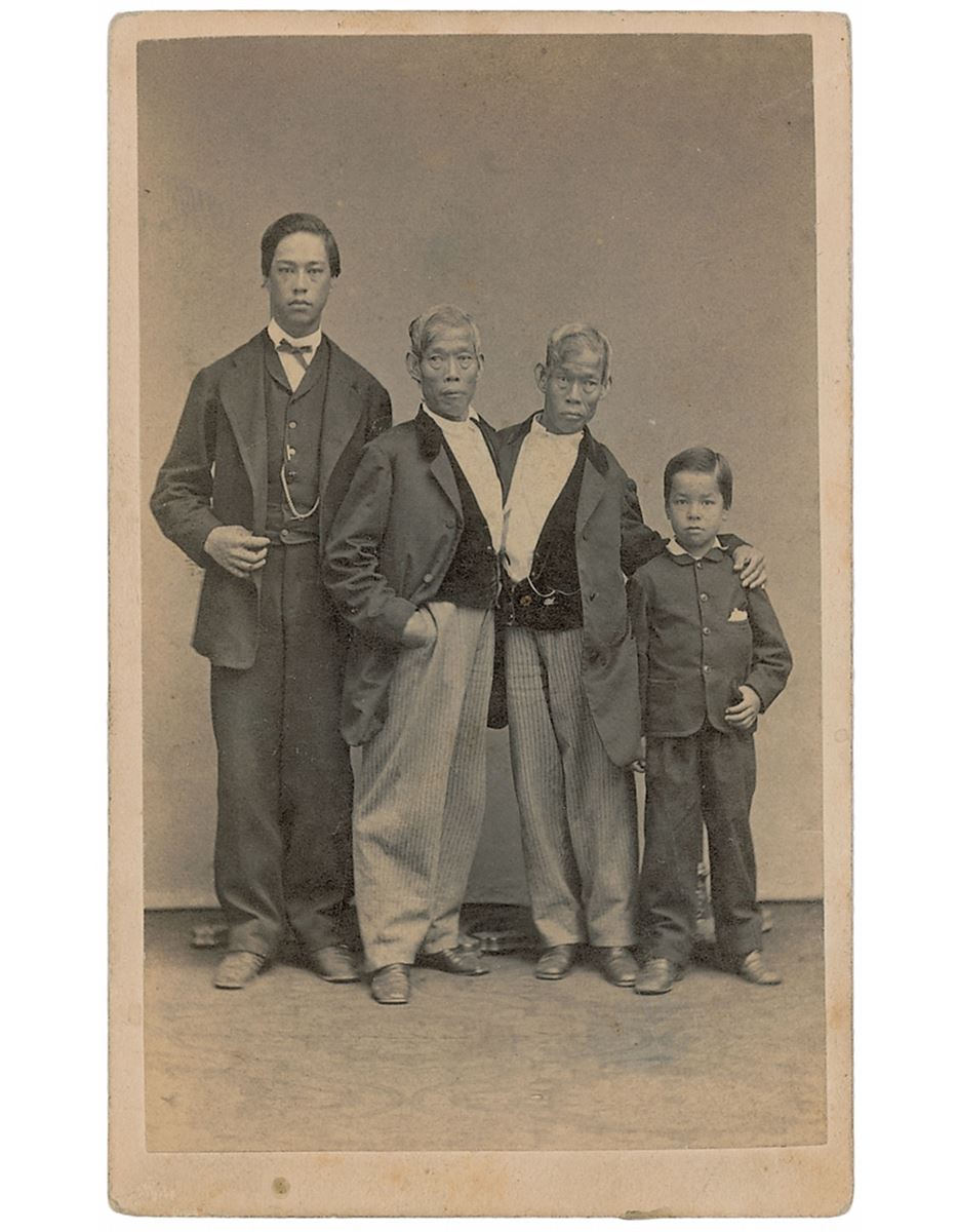 World-famous conjoined twins (1811–1874) born in Siam (now Thailand) from which the phrase 'Siamese twins' is derived. They were discovered by a Scottish merchant and exhibited around the world as a curiosity and made their way to the United States, where they were occasionally promoted by P. T. Barnum but found him stingy. The inseparable brothers eventually left show business and bought a plantation together in North Carolina and joined in matrimonial union with the Yates sisters, with whom they fathered a total of twenty-one children. Unsigned 2.25 x 4 carte-de-visite portrait of Chang and Eng Bunker in between two of their sons, with Chang’s son James on the left and Eng’s son Albert on the right. Published by S. Masury of Boston. In fine condition, with trivial soiling to the mount. Chang and Eng, as well as the photographer, Samuel Masury, all passed away in 1874, and this image was captured some time in the preceding decade. A scarce image of the pair with excellent contrast.