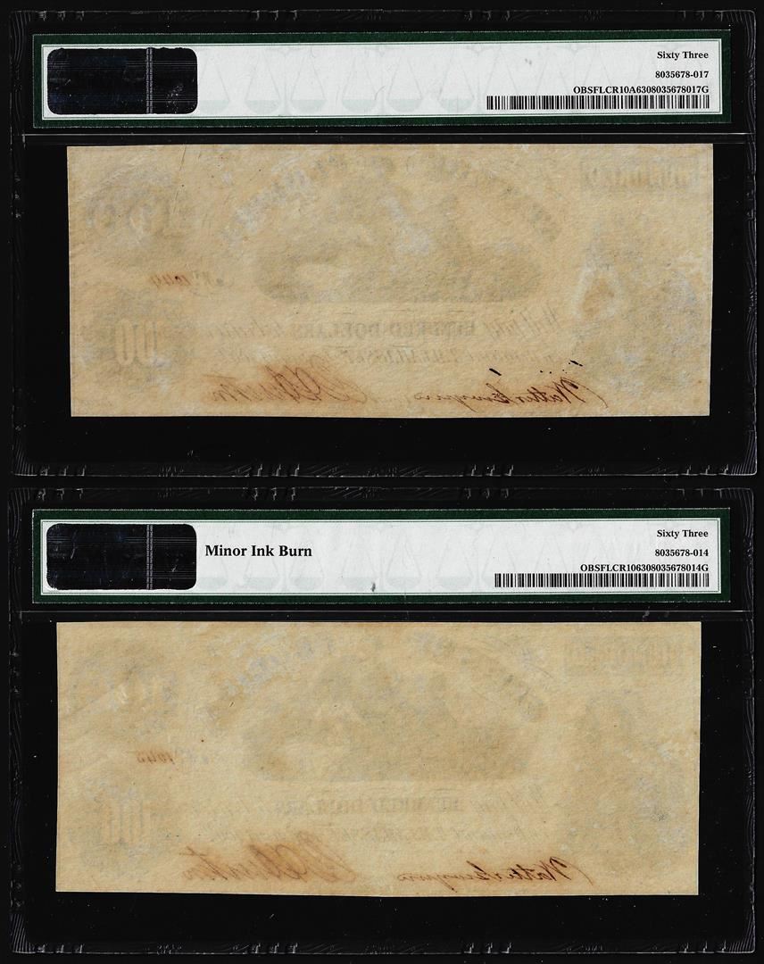 Change Over Pair of 1862 $100 State of Florida Cr.10/10A Obsolete Notes PMG Choice Uncirculated 63. A very nice pair of Florida state issue $100s that qualify as a "crossover pair." The first note, with serial number 1044, displays plate letter H with a cross bar while the second piece, with serial number 1045, is the variety where the plate letter H does not have a cross bar. PMG Certified.