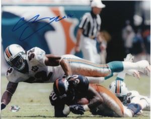 Channing Crowder was drafted by the Miami Dolphins in the third round (70th overall) in the 2005 NFL Draft. Crowder was once again a reliable starter in 2006 and continued to progress as a player. He finished second on the Dolphins with 104 tackles (behind only Zach Thomas) and had one sack for nine yards in losses this season. Channing Crowder has hand autographed this Miami Dolphins 8x10 Photo. FI Hologram and Certificate of Authenticity from Athlon Sports.