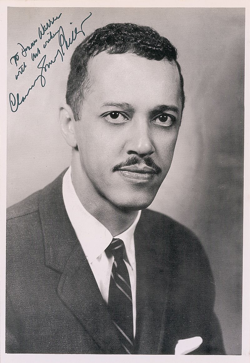 Minister and civil rights activist (1928–1987) who became the first African American to receive votes for the presidential nomination at the 1968 Democratic National Convention. Semi-glossy 6.75 x 10 cardstock photo, signed and inscribed in black felt tip “To Dennis Warren, with best wishes, Channing Emery Phillips.” In fine condition, with a trivial paperclip impression to the upper left and a lightly trimmed right edge.