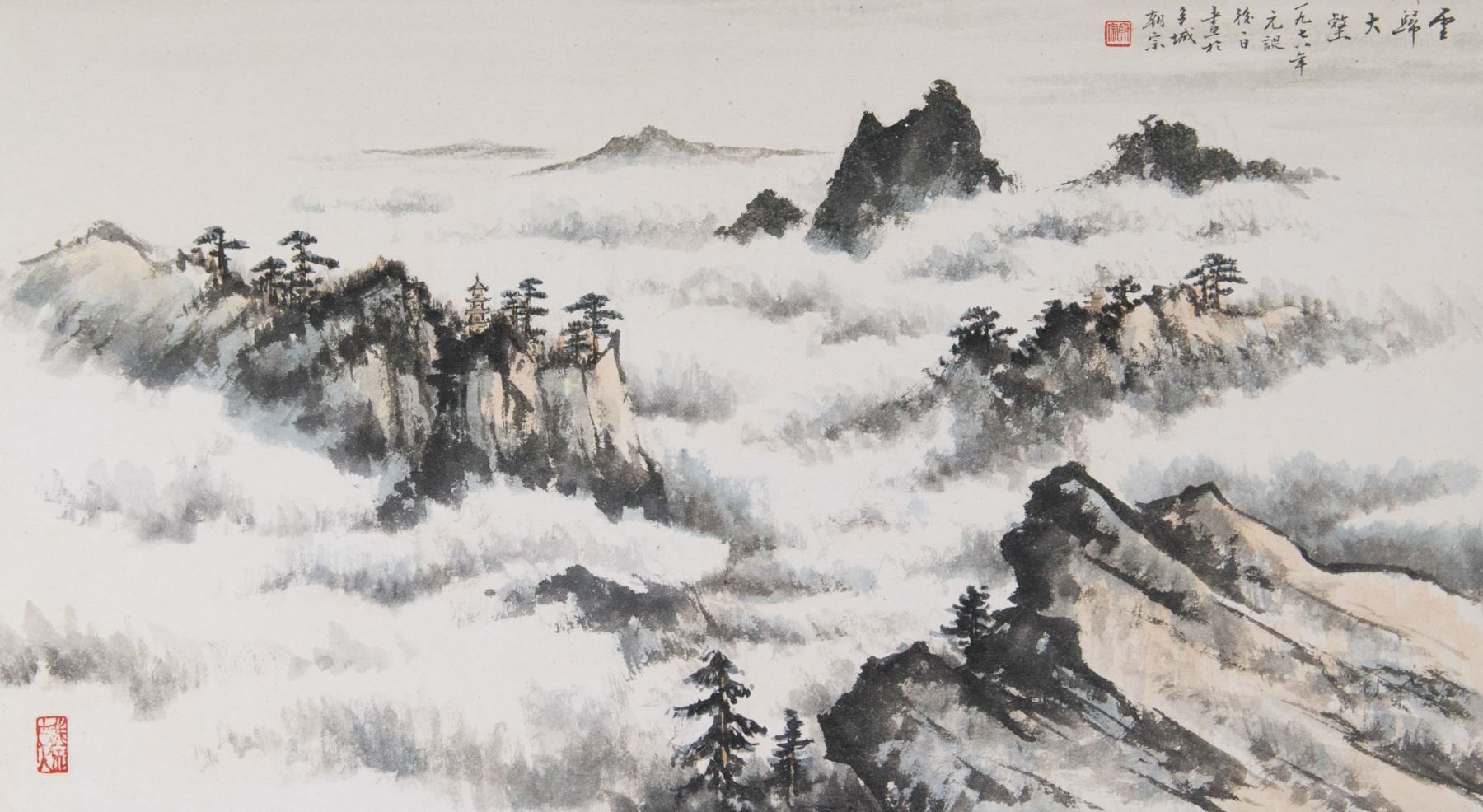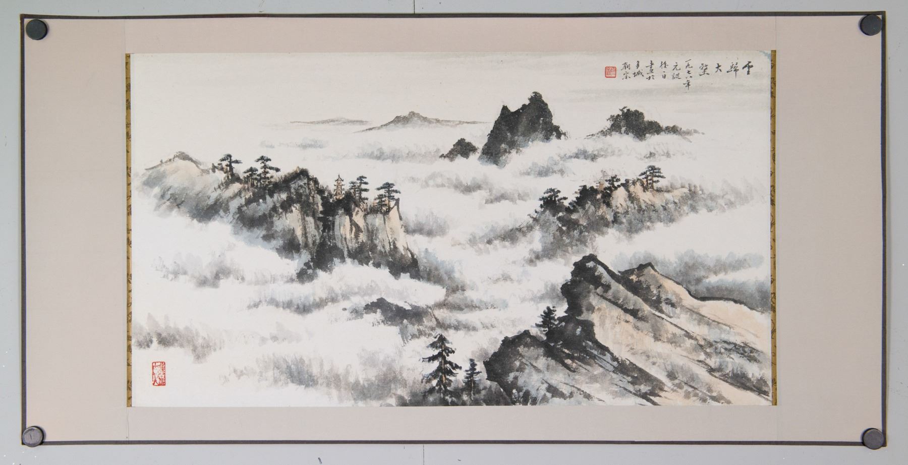 Ink and watercolor on paper roll. Featuring mountainous landscape. Signed Chao Zong, inscribed with 2 artist seals. 33 x 60 cm