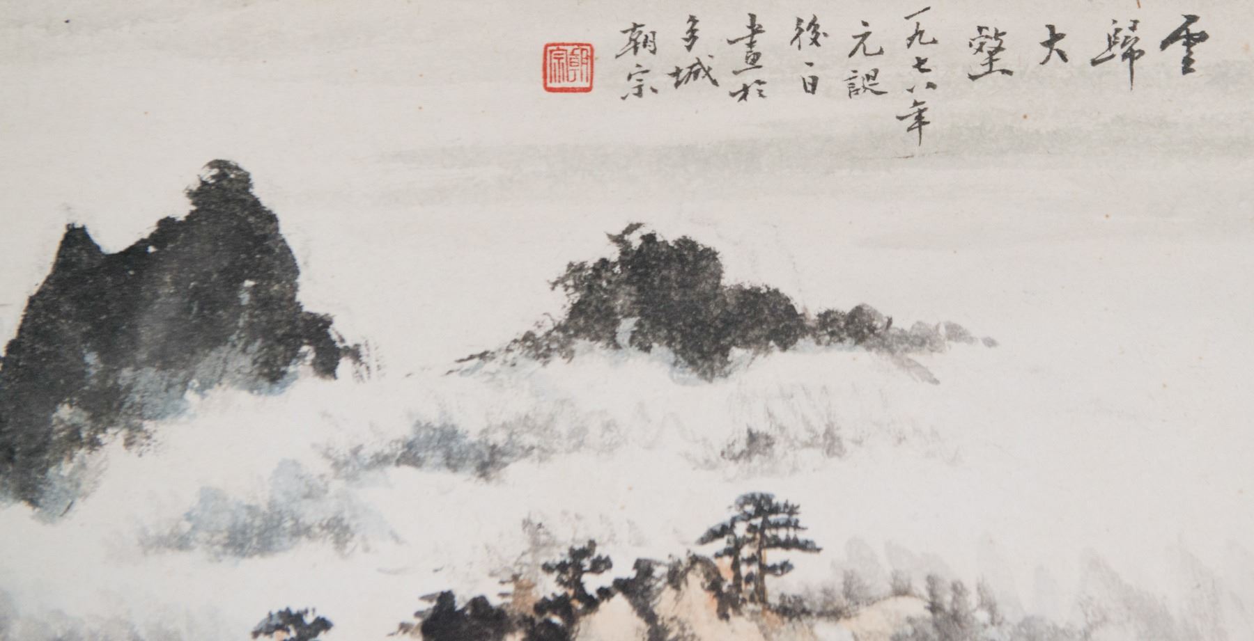 Ink and watercolor on paper roll. Featuring mountainous landscape. Signed Chao Zong, inscribed with 2 artist seals. 33 x 60 cm