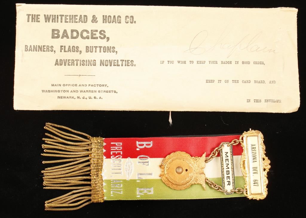 "The Whitehead & Hoag Co." badge in original envelope marked Chaplain, badge reads "Arizona Div. 647 Member B. of L.E> Prescott, Ariz.".