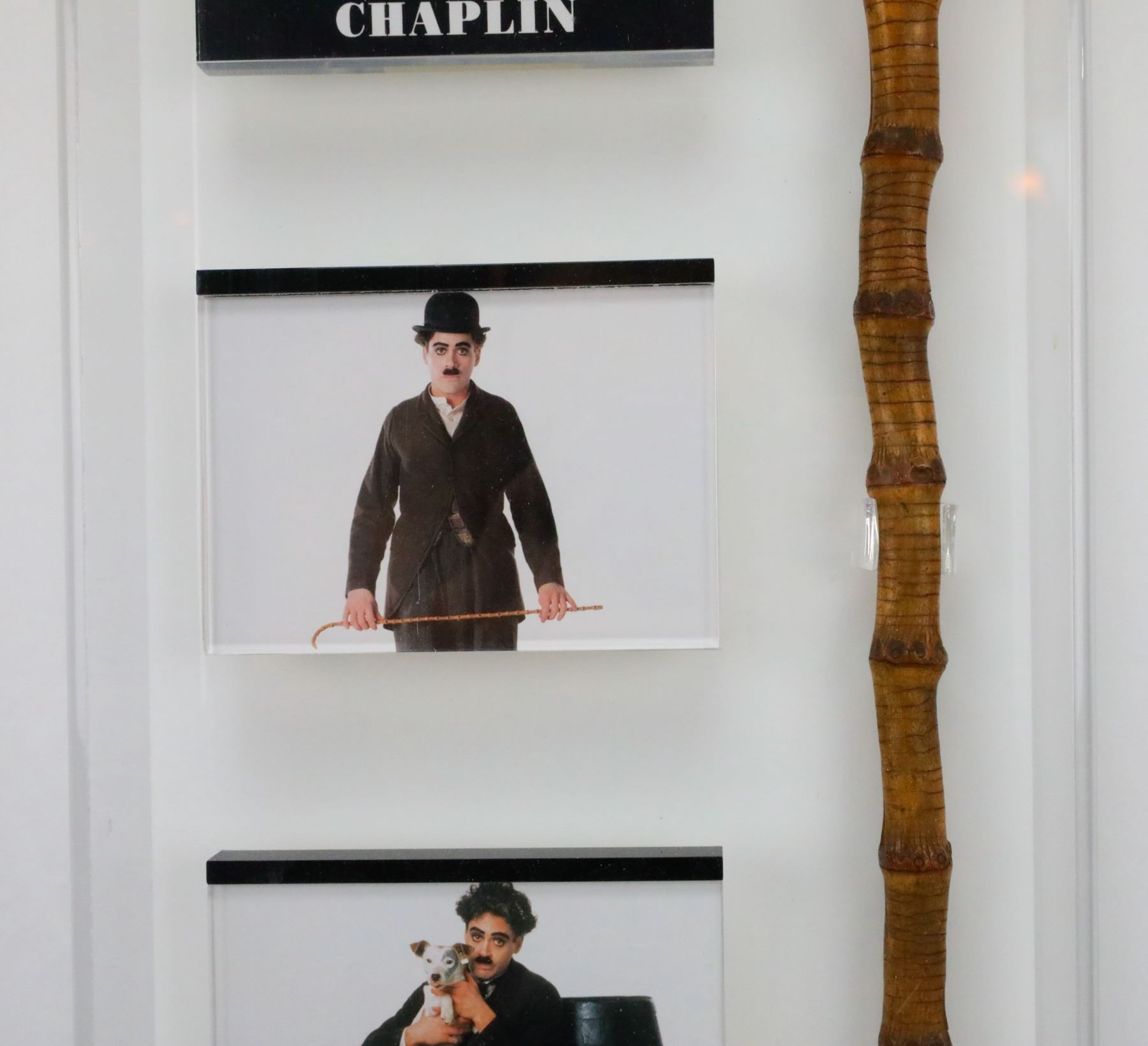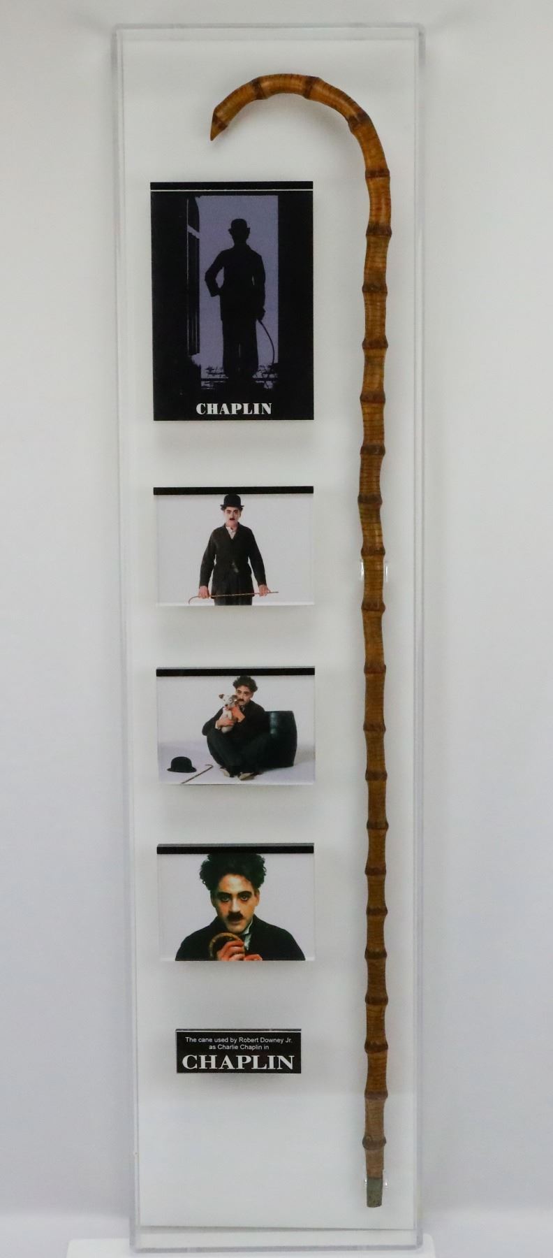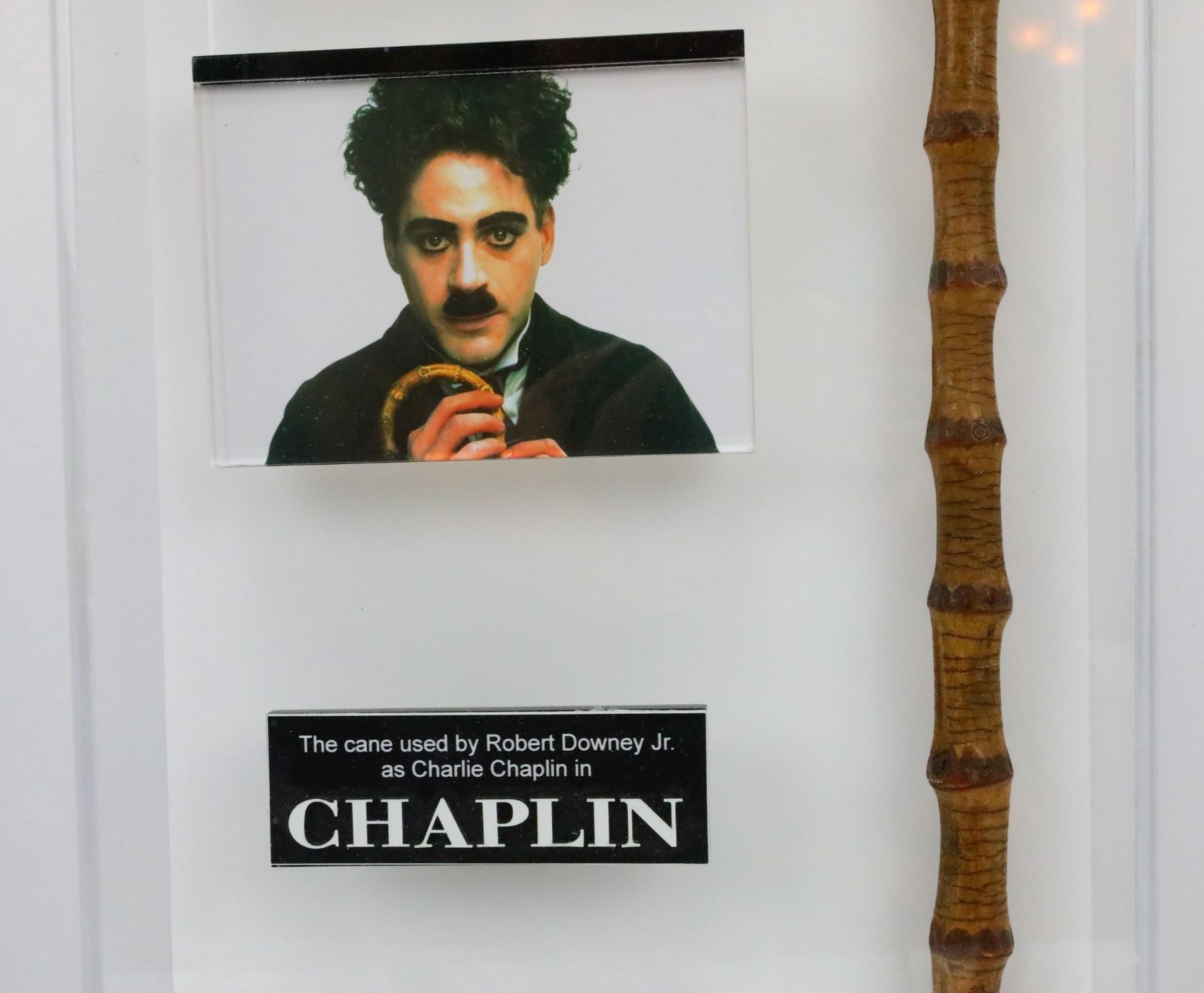 Chaplin (1992) Robert Downey Jr.'s Hero Prop Cane From Director Sir Richard Attenborough Professionally Mounted & Framed W/Promotional Photos - This hero prop cane was used during the filming of the 1992 British-American biographical comedy-drama film Chaplin, about the life of British comedian Charlie Chaplin. This cane was used by Robert Downey Jr. as he portrayed the title role of Charlie Chaplin, and was used throughout filming predominately in closeup shots. The cane was also used by Downey Jr. for publicity shots. The bamboo prop is virtually identical to the stick used by the real Chaplin as he portrayed his legendary Little Tramp character in the 1920's. The cane was originally personally donated by the film's director Sir Richard Attenborough to a charity radio auction as documented in the accompanying copy of the letter that was obtained before the director's death. It was then later sold at a movie auction with other costume pieces from the film. The cane has been professionally mounted and framed in a beautiful presentation in an acrylic box along with several promotional photos from the film. Robert Downey Jr. received universal acclaim for his performance as Chaplin, a role for which he won a BAFTA Award and was nominated for an Academy Award. The film was also nominated for two additional Academy Awards, two BAFTA Awards and three Golden Globe Awards.