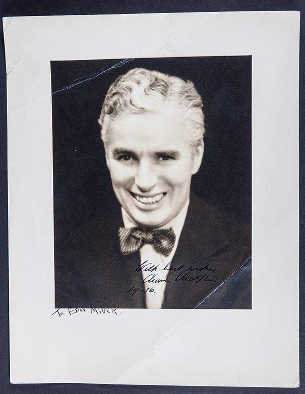 Chaplin, Charlie (1889-1957) British silent screen comic actor and filmmaker, best known for his portrayal of the character, the LittleTramp; in 1919 he co-founded United Artists with Douglas Fairbanks, Mary Pickford, and D. W. Griffith. Vintage photo inscribed and signed "With best wishes / Charlie Chaplin / 1936," 11 x 14 in. Inscribed "To Edw Miller" at lower left in another hand. Large diagonal creases at upper left and lower right, not affecting Chaplin's image or writing. A handsome head-and-shoulders portrait.
