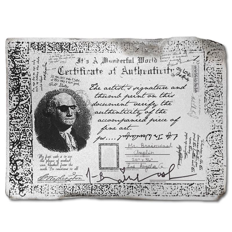 "Chaplin" is a mixed media original on deckle edge paper by Mr. Brainwash, hand signed inverso and bearing the thumbprint of the artist. This piece comes custom framed. Includes Certificate of Authenticity. Measures approx. 40" x 30" (frame), 36" x 24" (image).