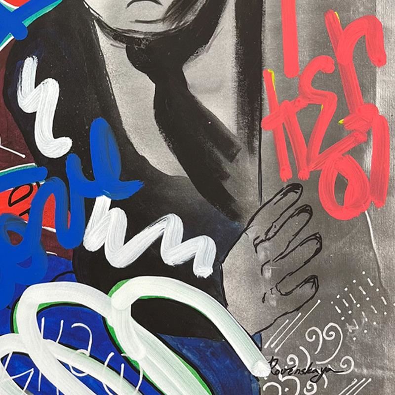 "Chaplin is Hiding" is a one-of-a-kind mixed media on deckle edge paper by Nastya Rovenskaya; hand signed by the artist. This piece comes custom framed and includes letter of authenticity. Measures approximately 34" x 29" (framed), 28" x 23" (image).